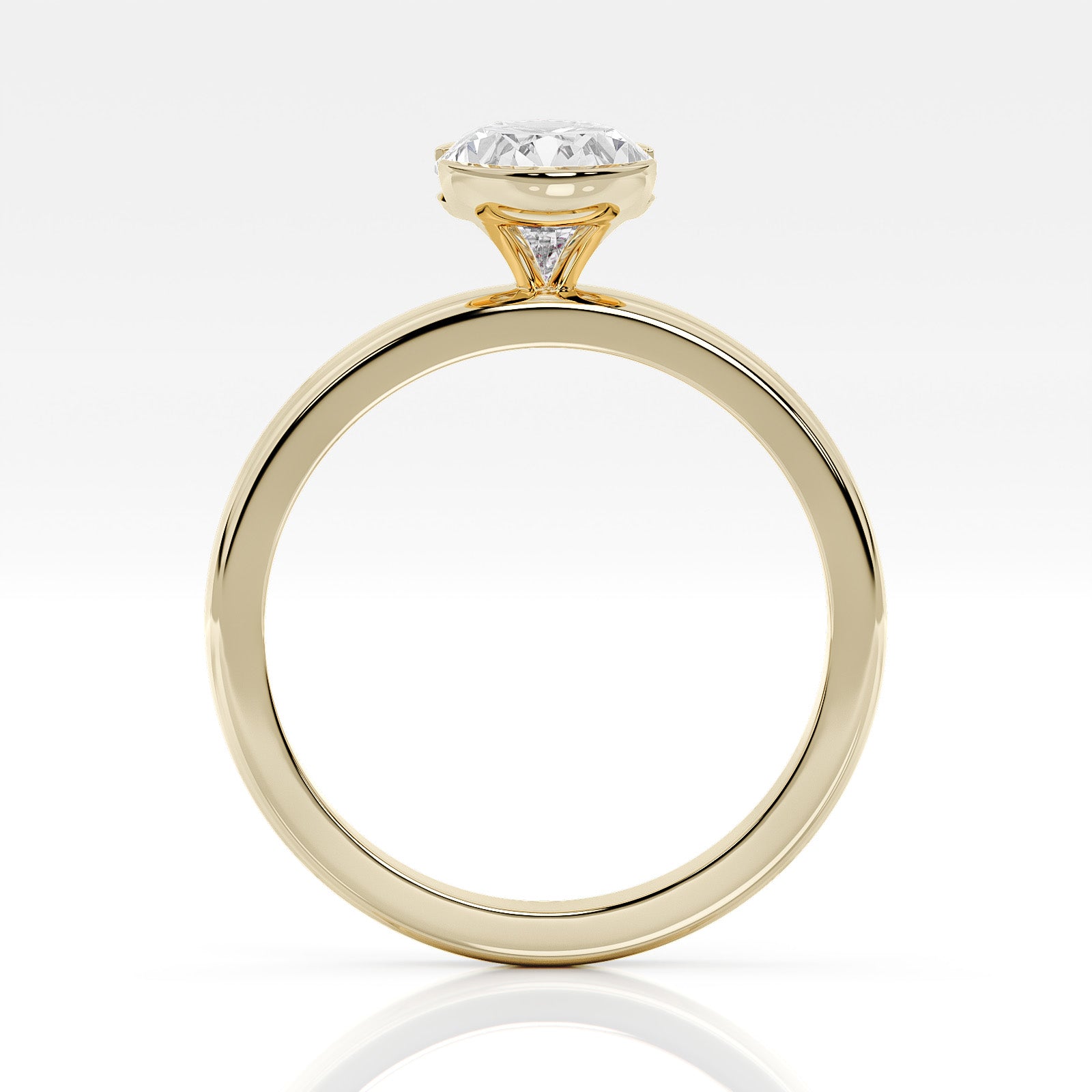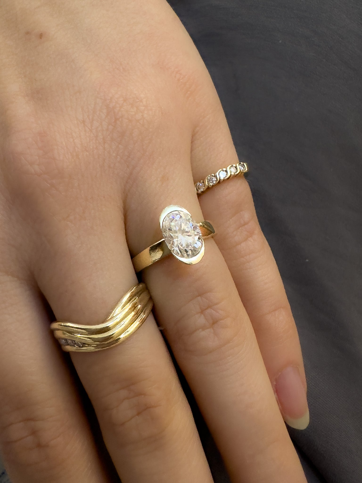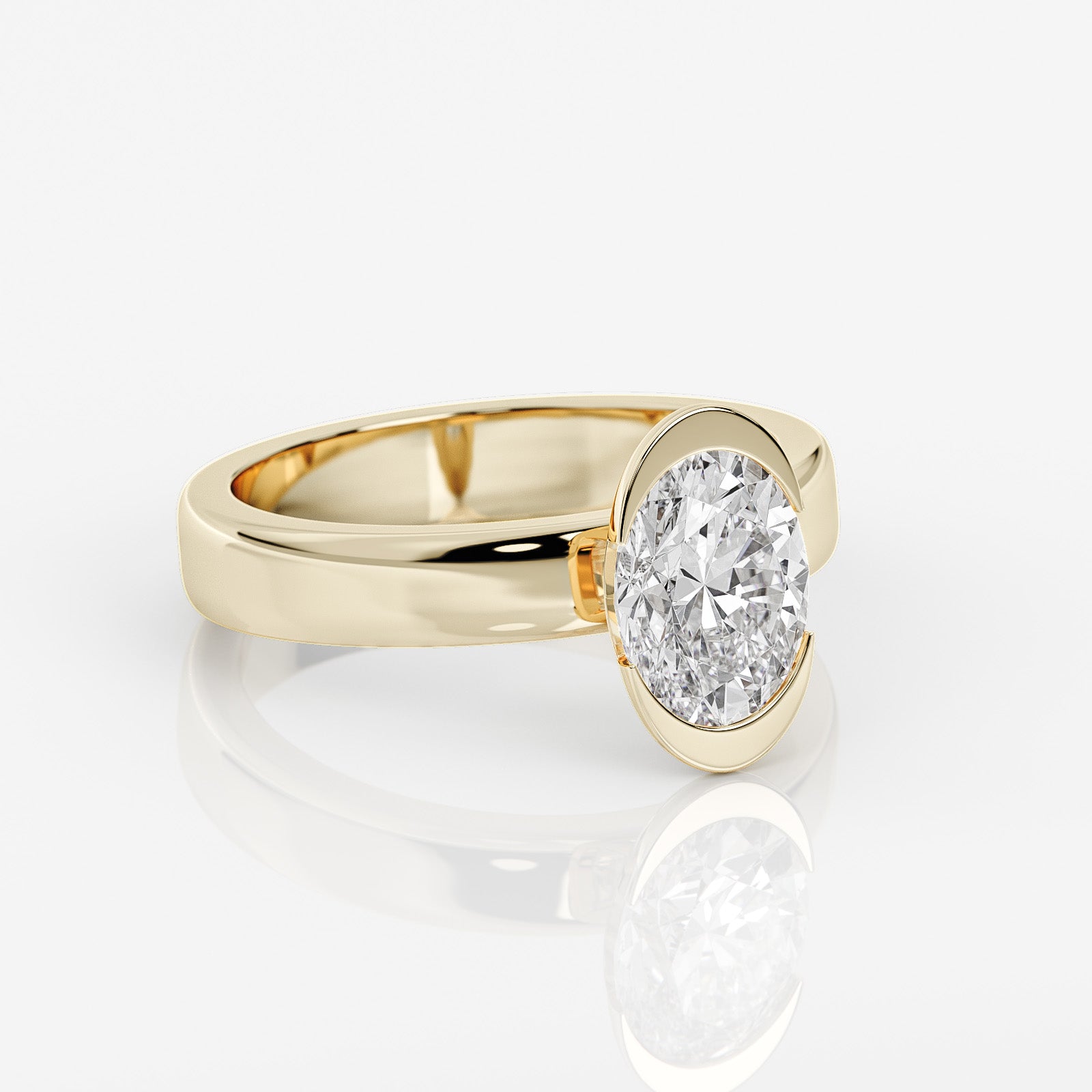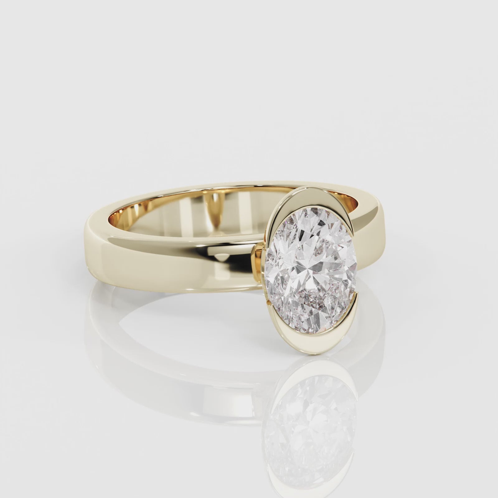 Available in 1.5ct and 2ct lab-grown diamond options. A modern interpretation of the classic half bezel, the Alora Ring features an oval lab-grown diamond secured by tapering arcs of gold at the top and base of the stone. This setting leaves the sides open, allowing light to flood through and giving the diamond an almost suspended quality. Available in solid yellow or white gold, the wide band adds balance and presence, making this a ring that feels both contemporary and enduring.