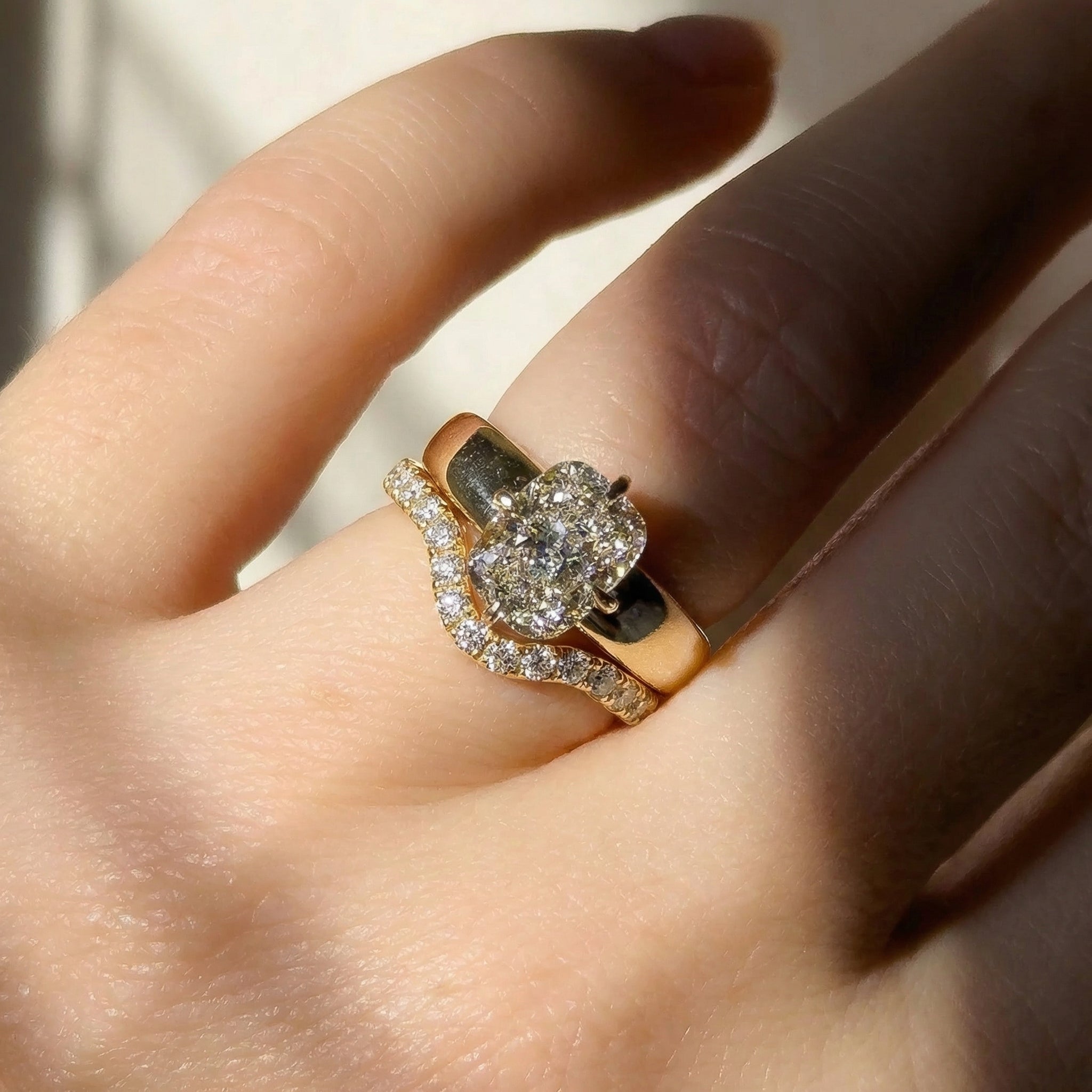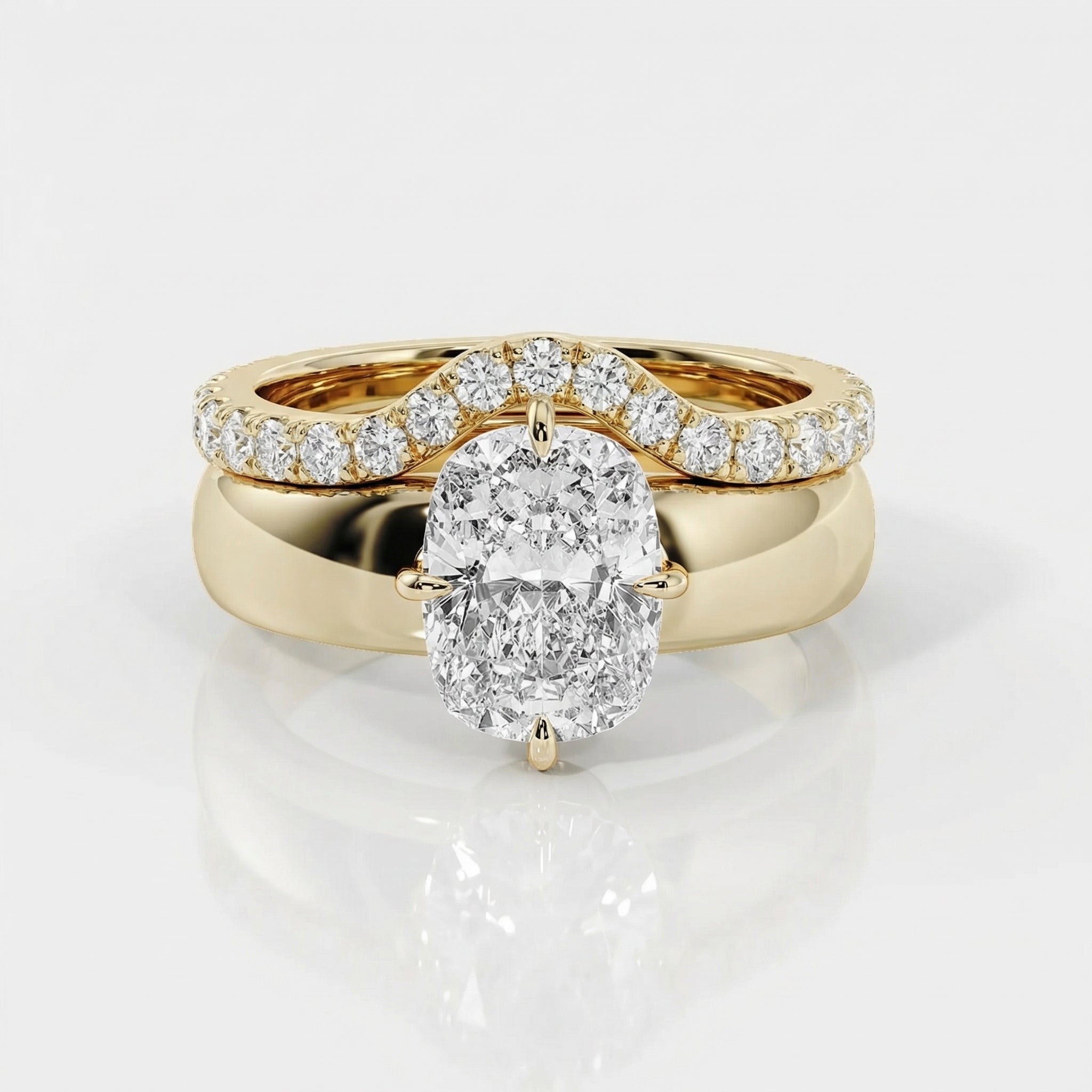 Gia features a 2ct+ elongated cushion cut lab-grown diamond set in a compass four-claw setting. The band is wide/chunky and tapers smoothly toward the base, giving the ring a bold, balanced form.