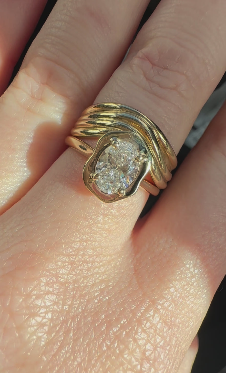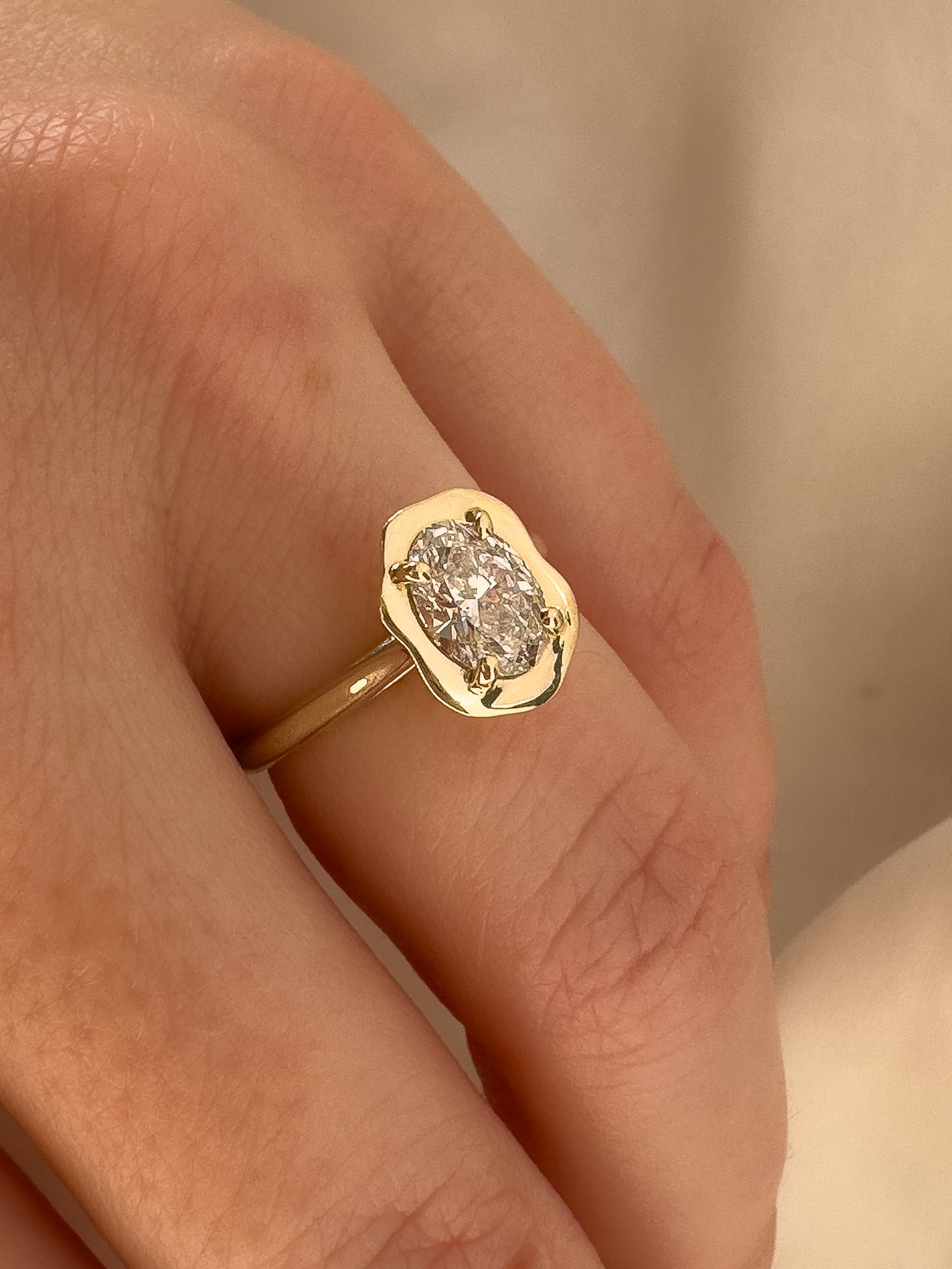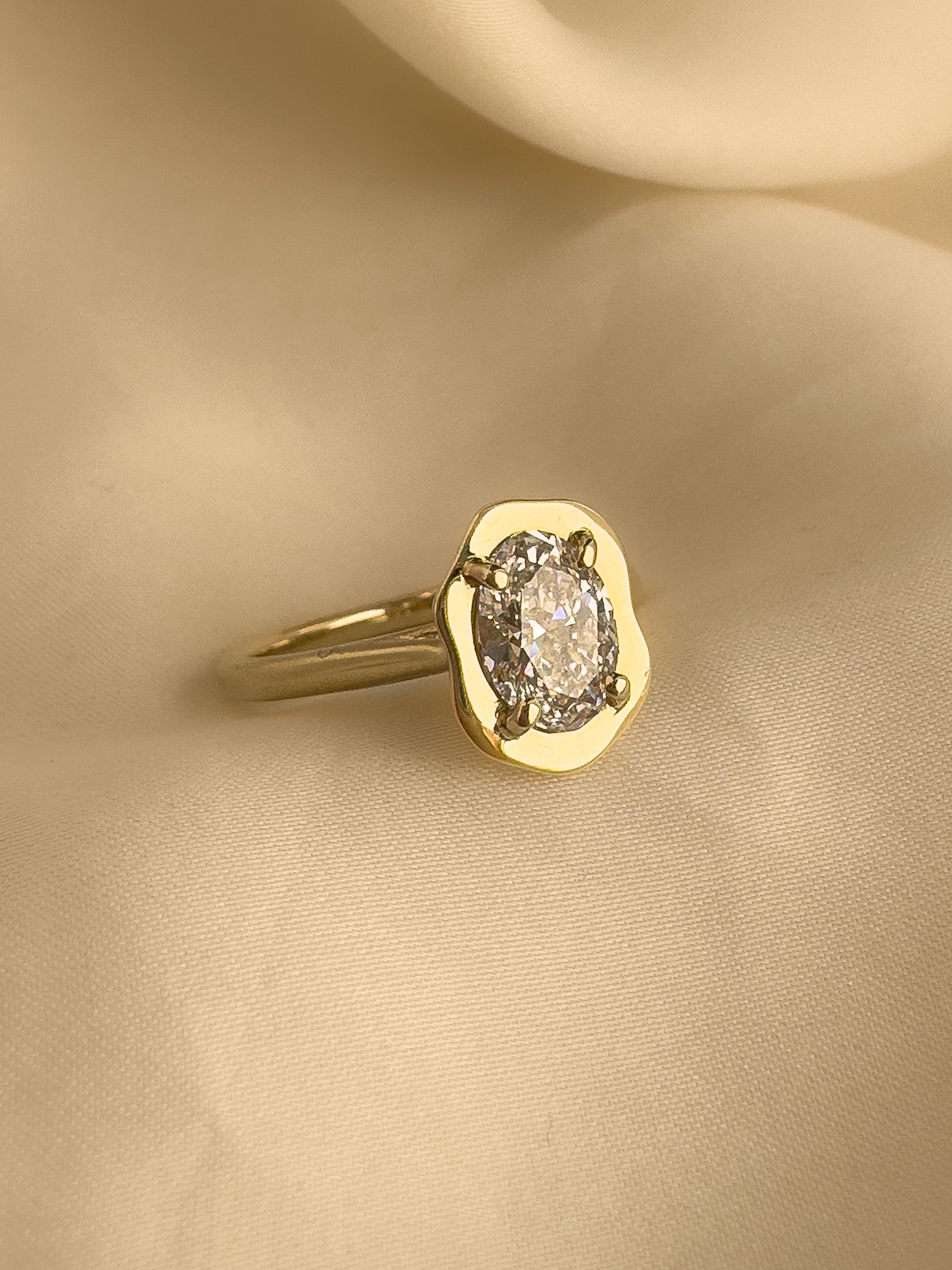 A completely unique solitaire ring featuring a centre oval lab diamond or Moissanite surrounded by a beautifully organic gold border. For engagement and other.