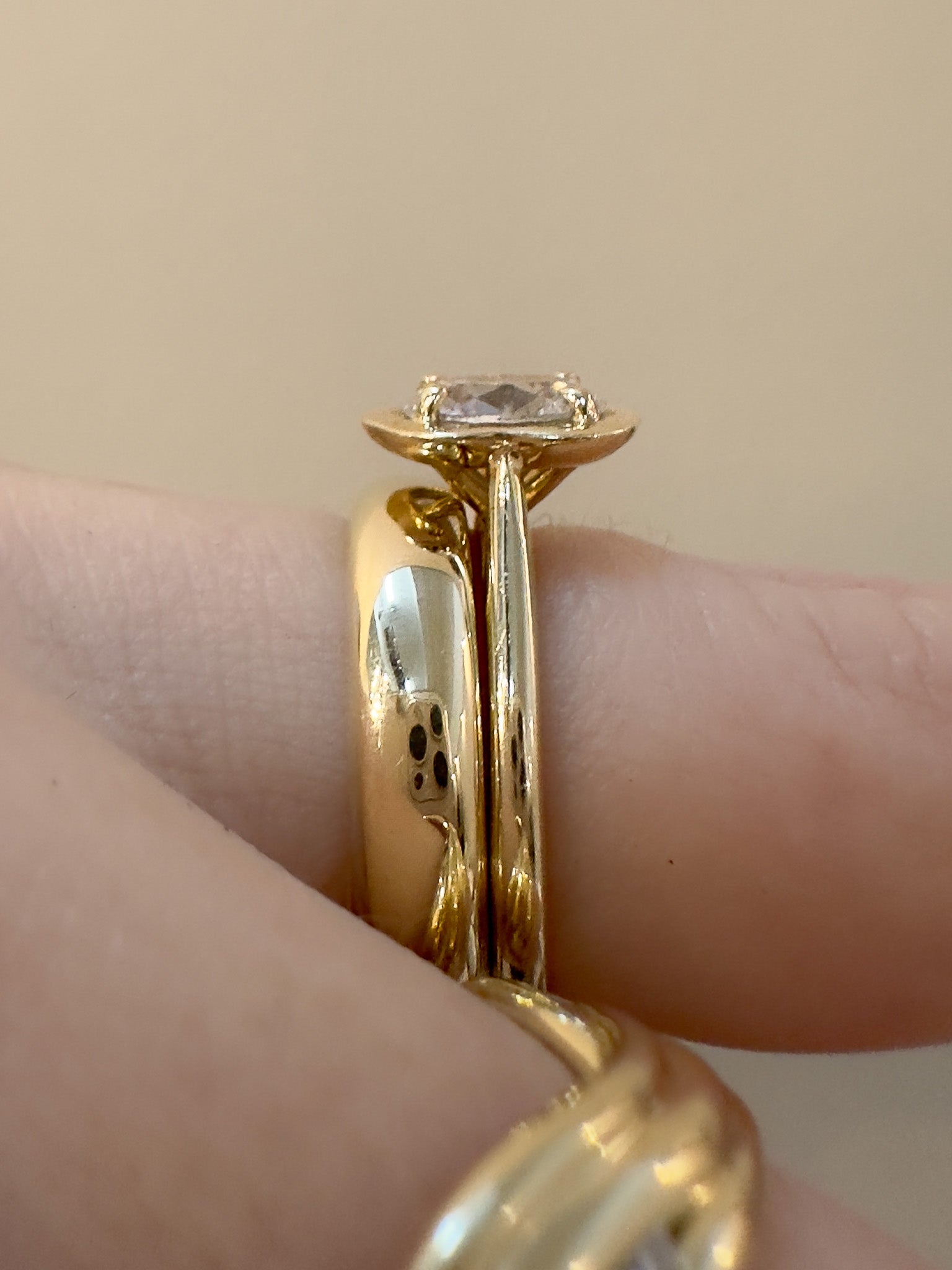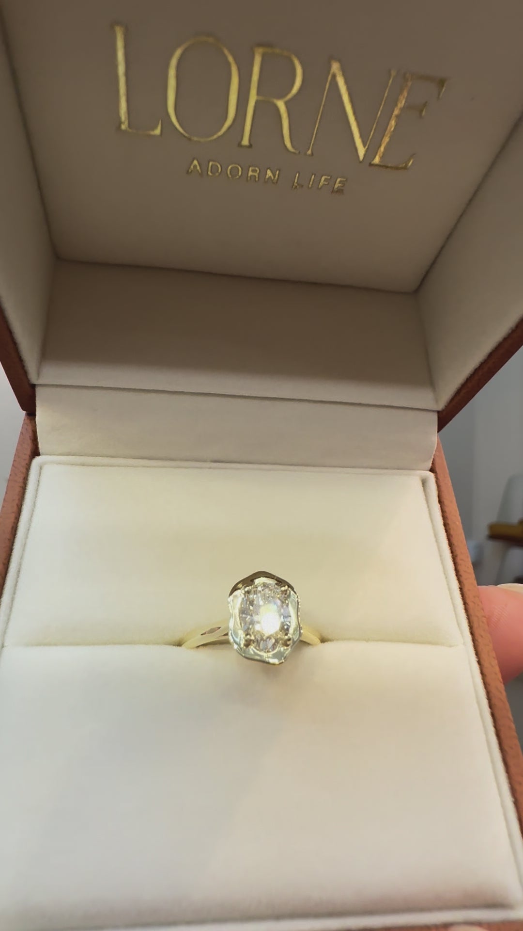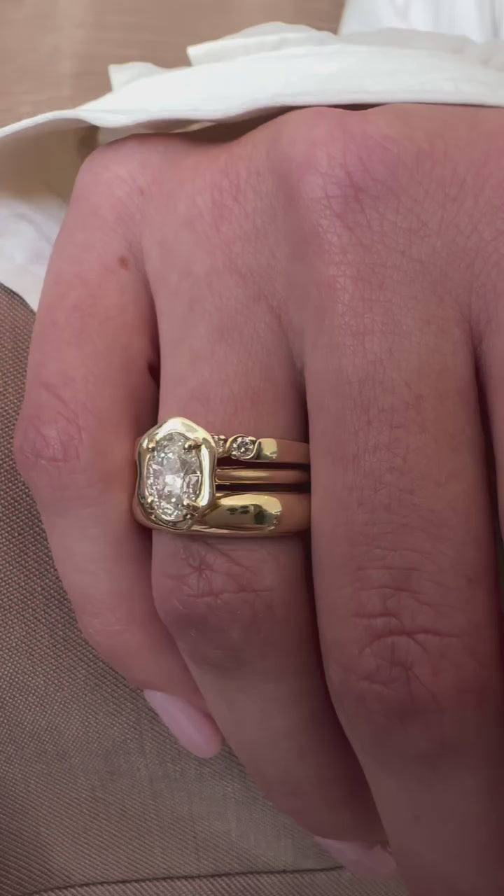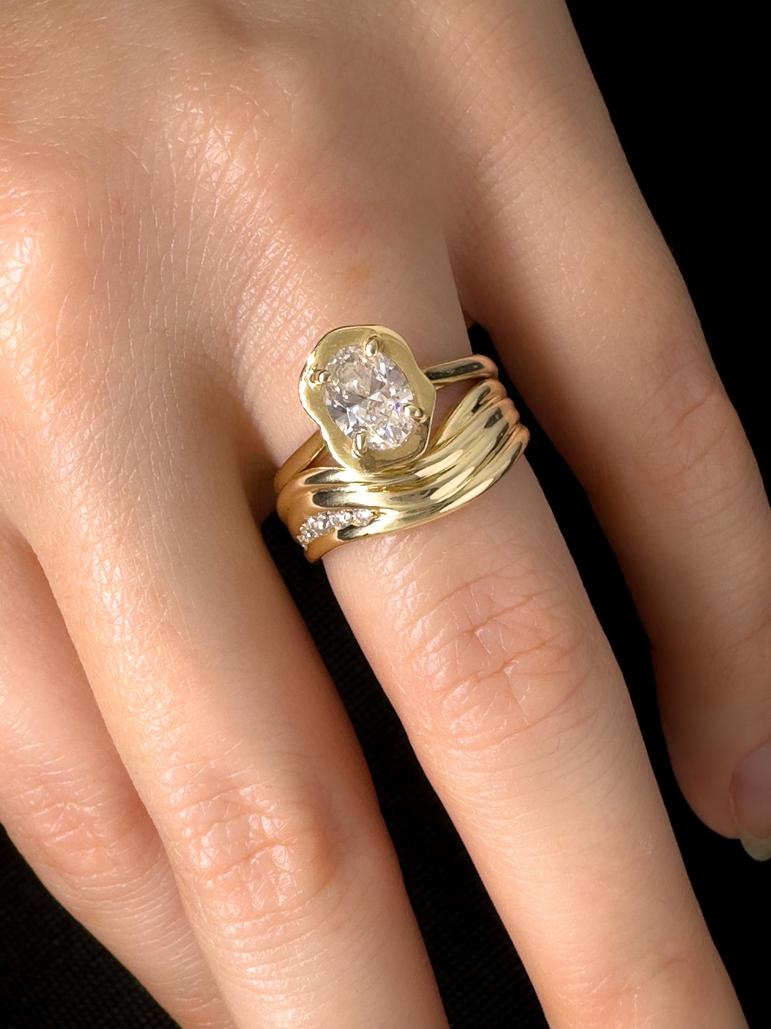A completely unique solitaire ring featuring a centre oval lab diamond or Moissanite surrounded by a beautifully organic gold border. For engagement and other.