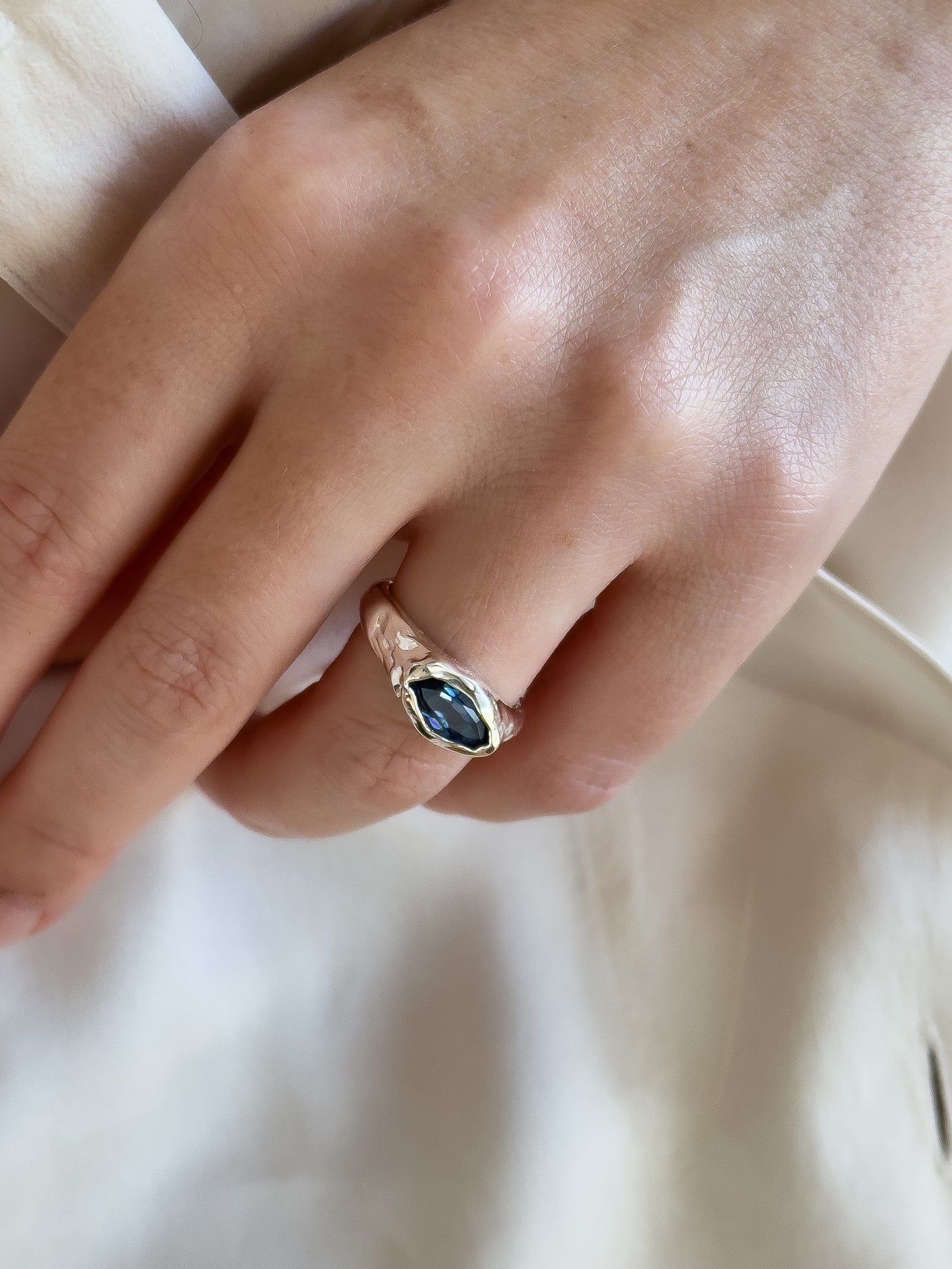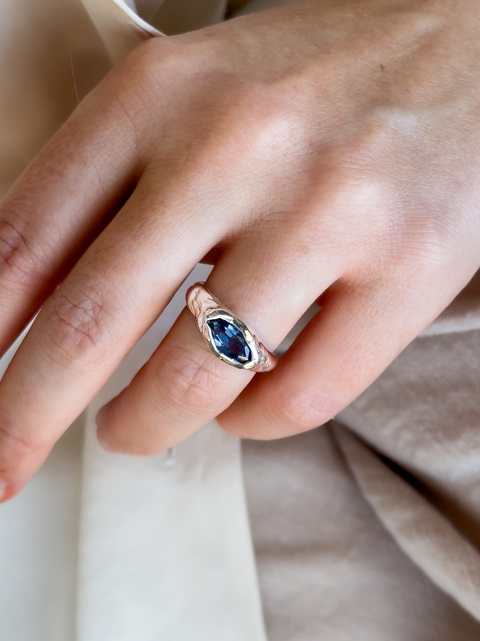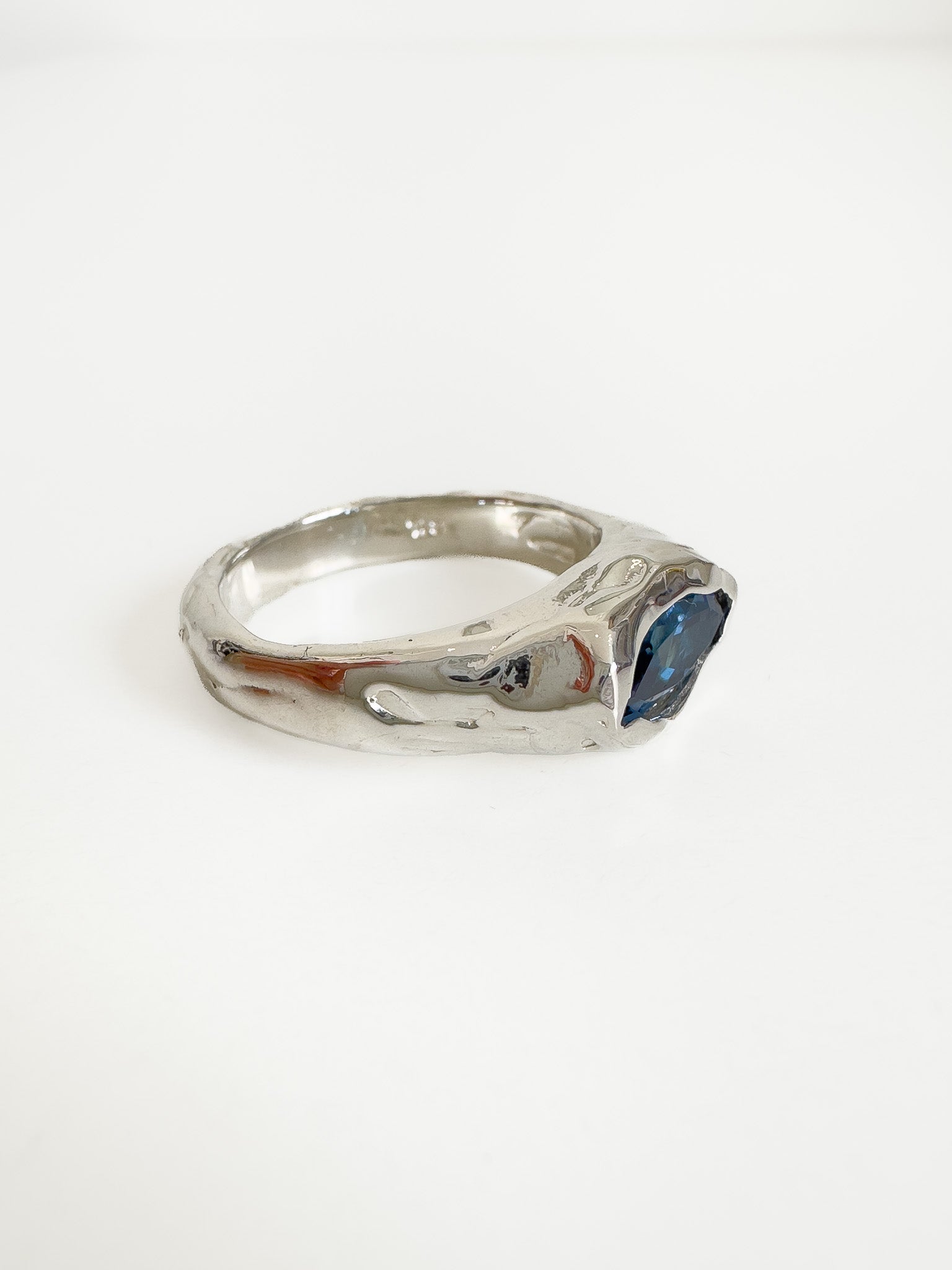 Wax carved silver ring with marquise cut Tanzanite gemstone.