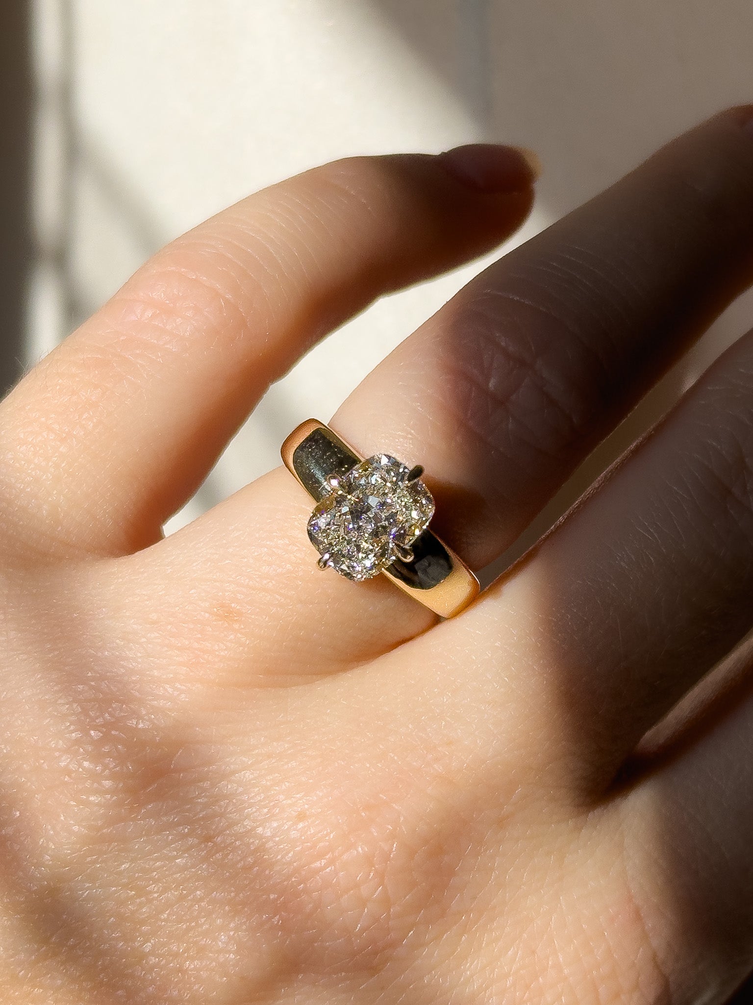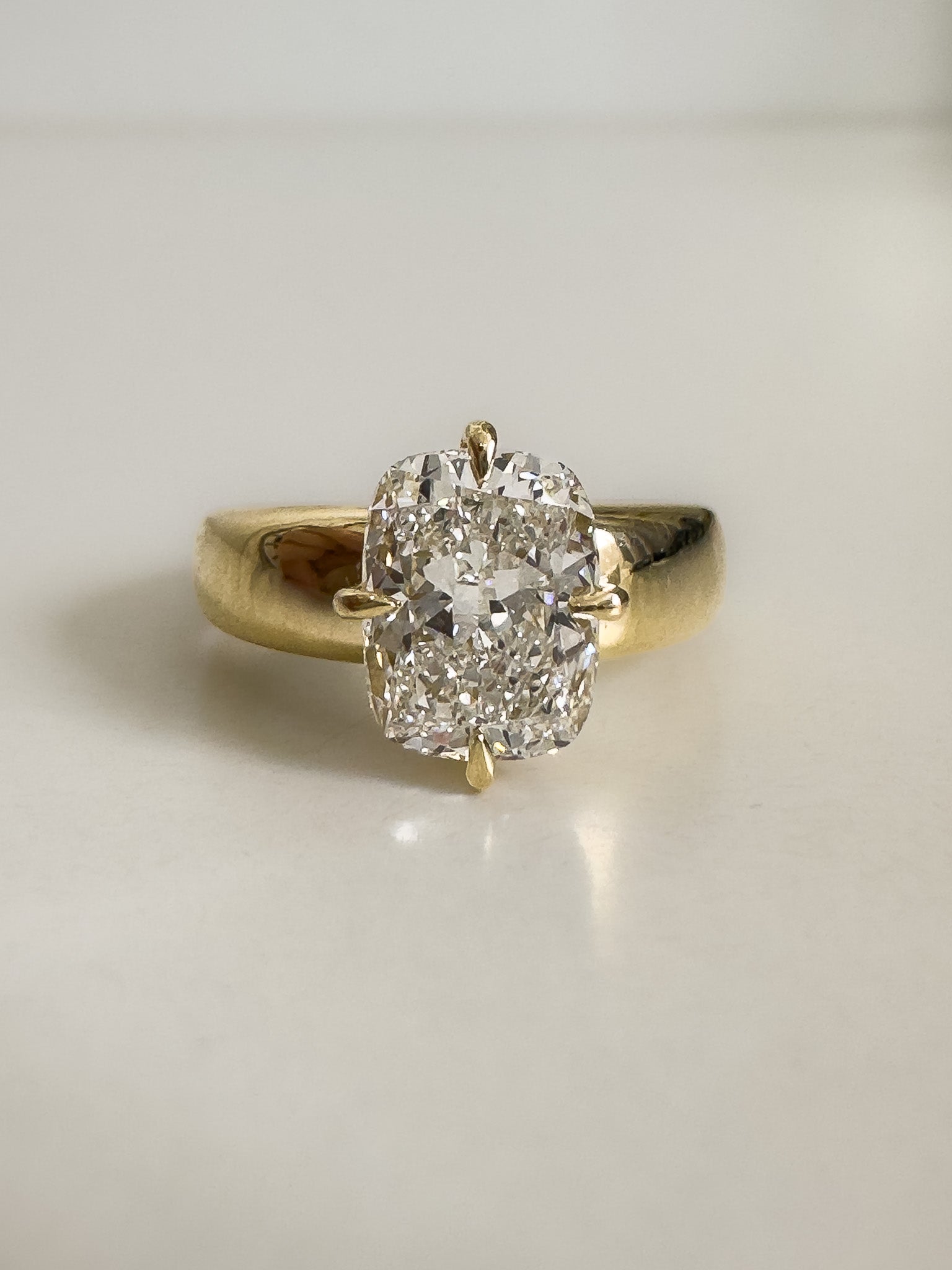 Gia features a 2ct+ elongated cushion cut lab-grown diamond set in a compass four-claw setting. The band is wide/chunky and tapers smoothly toward the base, giving the ring a bold, balanced form.