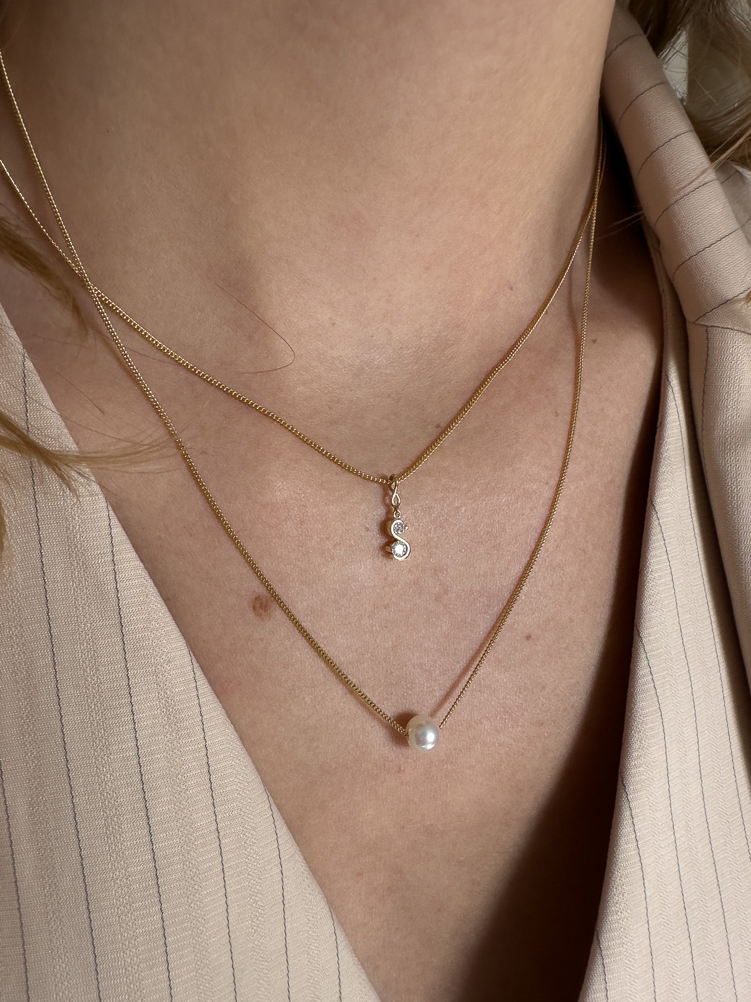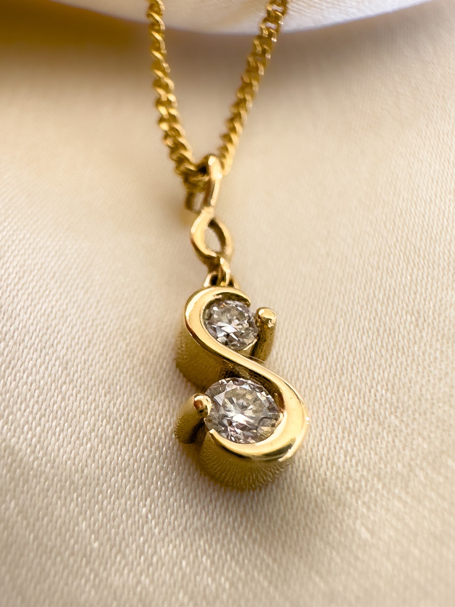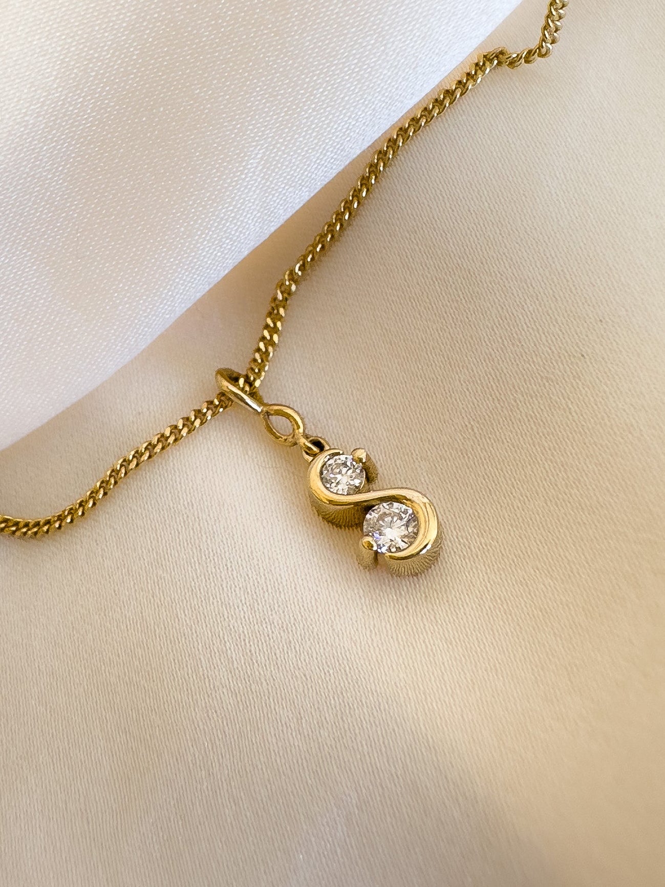 A dainty necklace featuring an infinity bail and a "Toi et Moi" or "you and me" pendant. The pendant comes with a beautiful 9ct. gold 1mm curb chain.