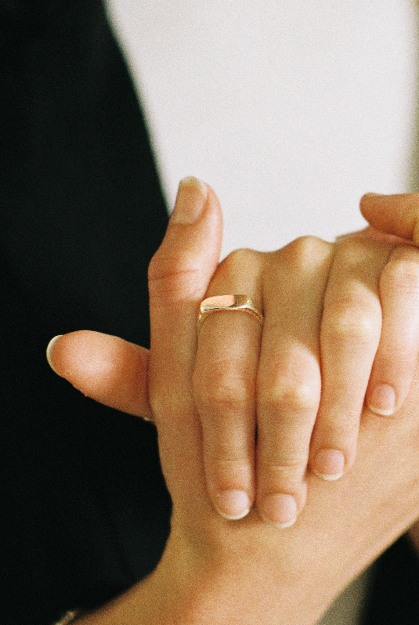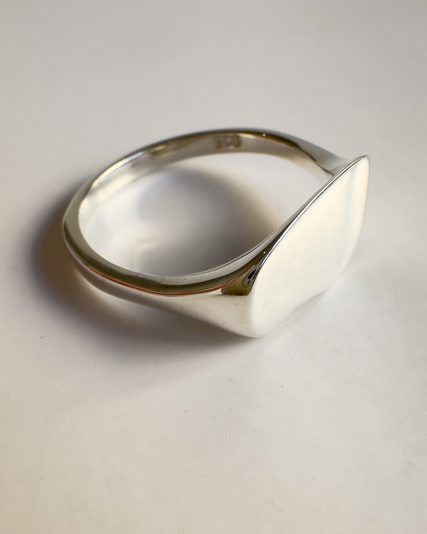 With a distinctive bean shaped flat top and sleek lines, this ring offers a fresh take on the classic signet ring style.