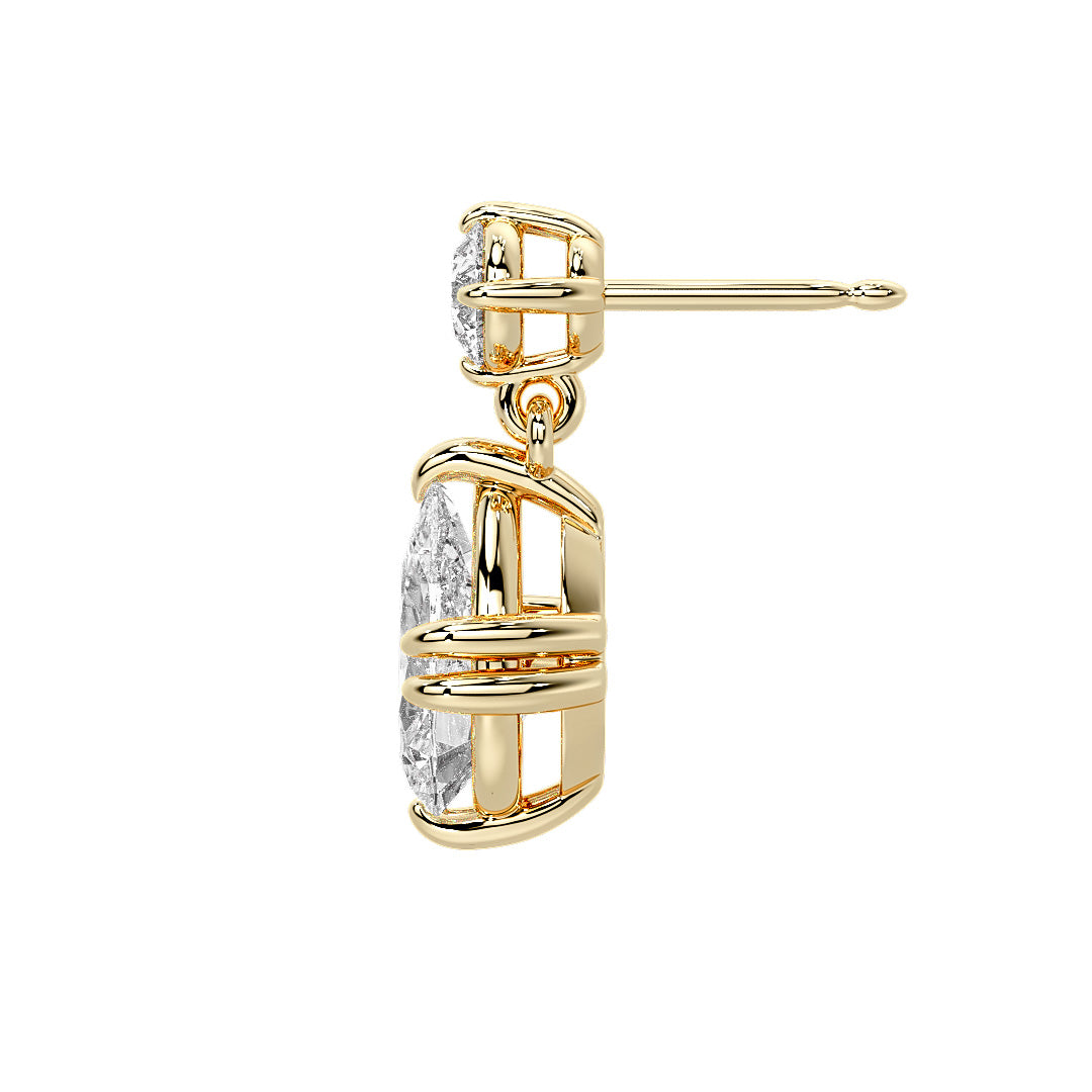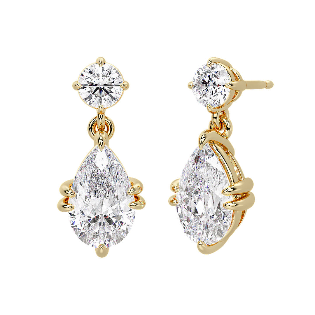 Introducing the Amara Earrings. A considered take on classic drop earrings, the Amara design pairs a round stud with a suspended 1ct. pear-cut stone. Dazzling in proportion and designed with subtle movement, they catch the light joyously.