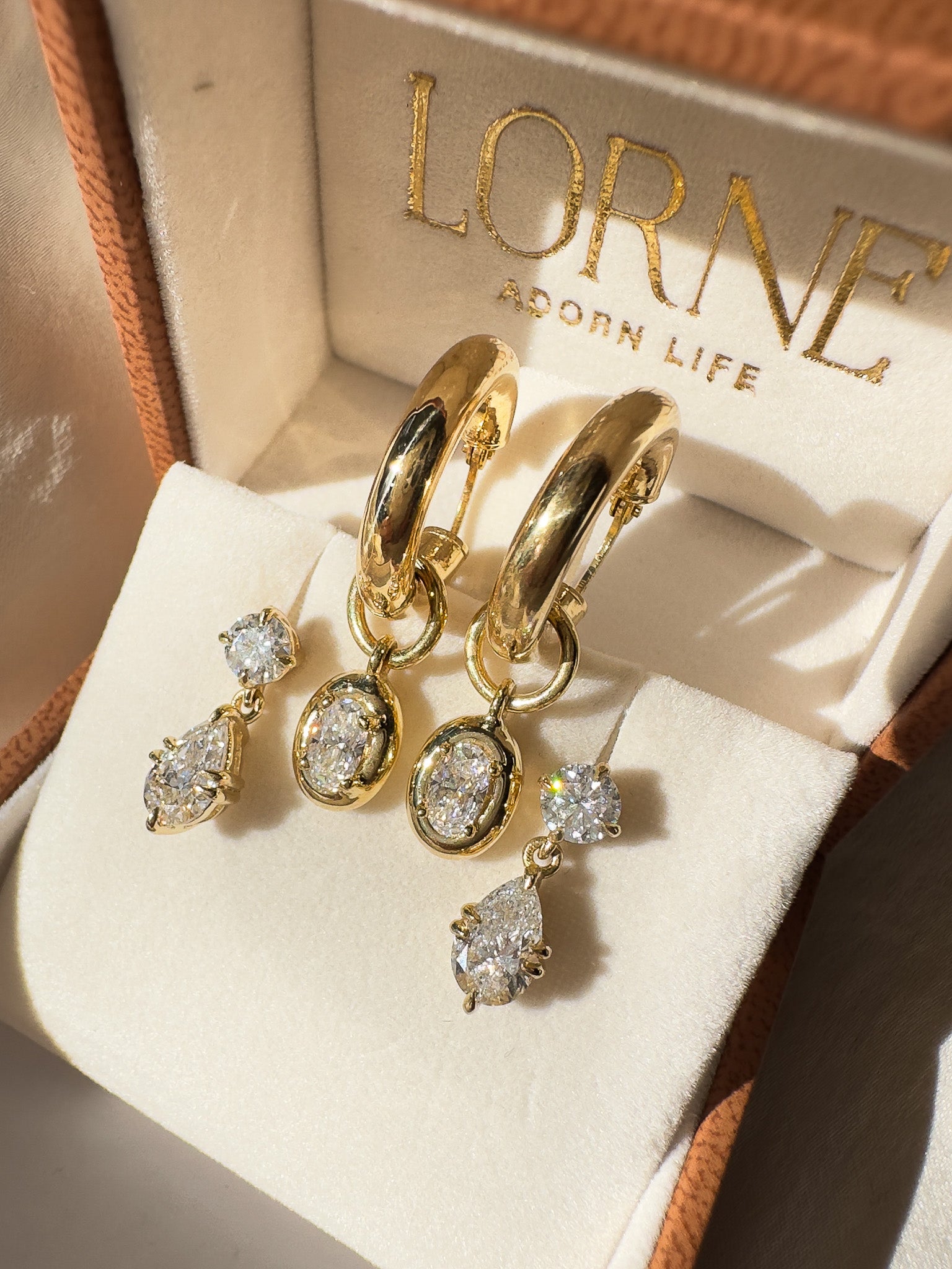Sleek and striking, this gold hoop is paired with a detachable charm set with an oval-cut lab diamond or moissanite. The stone is held in a unique setting that blends the softness of a rounded bezel with the subtle detail of fine prongs. Designed for comfort and movement, it's a well-proportioned piece for those who want something substantial.