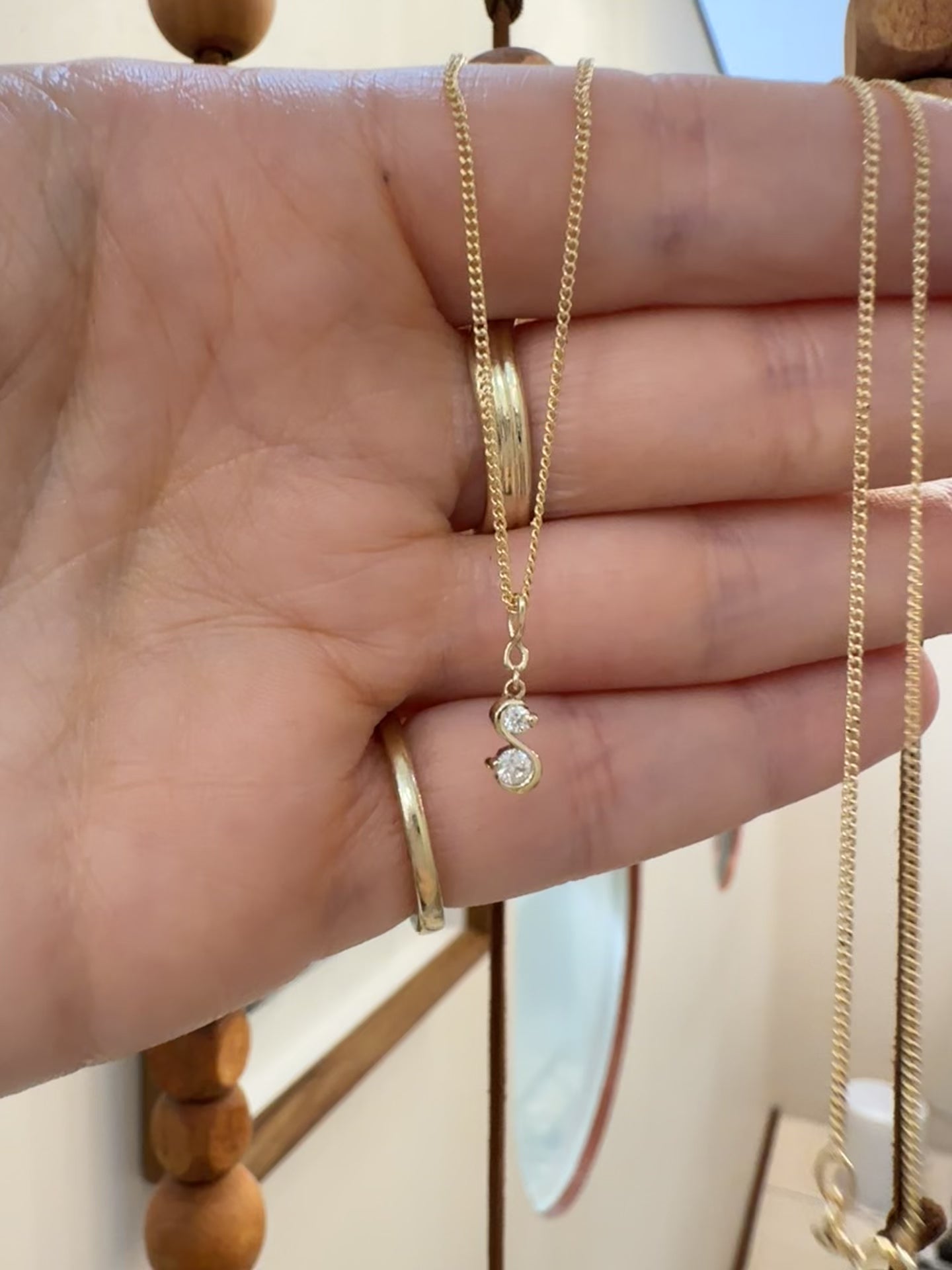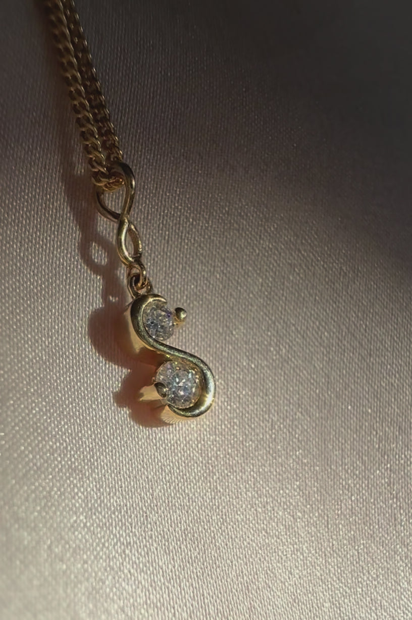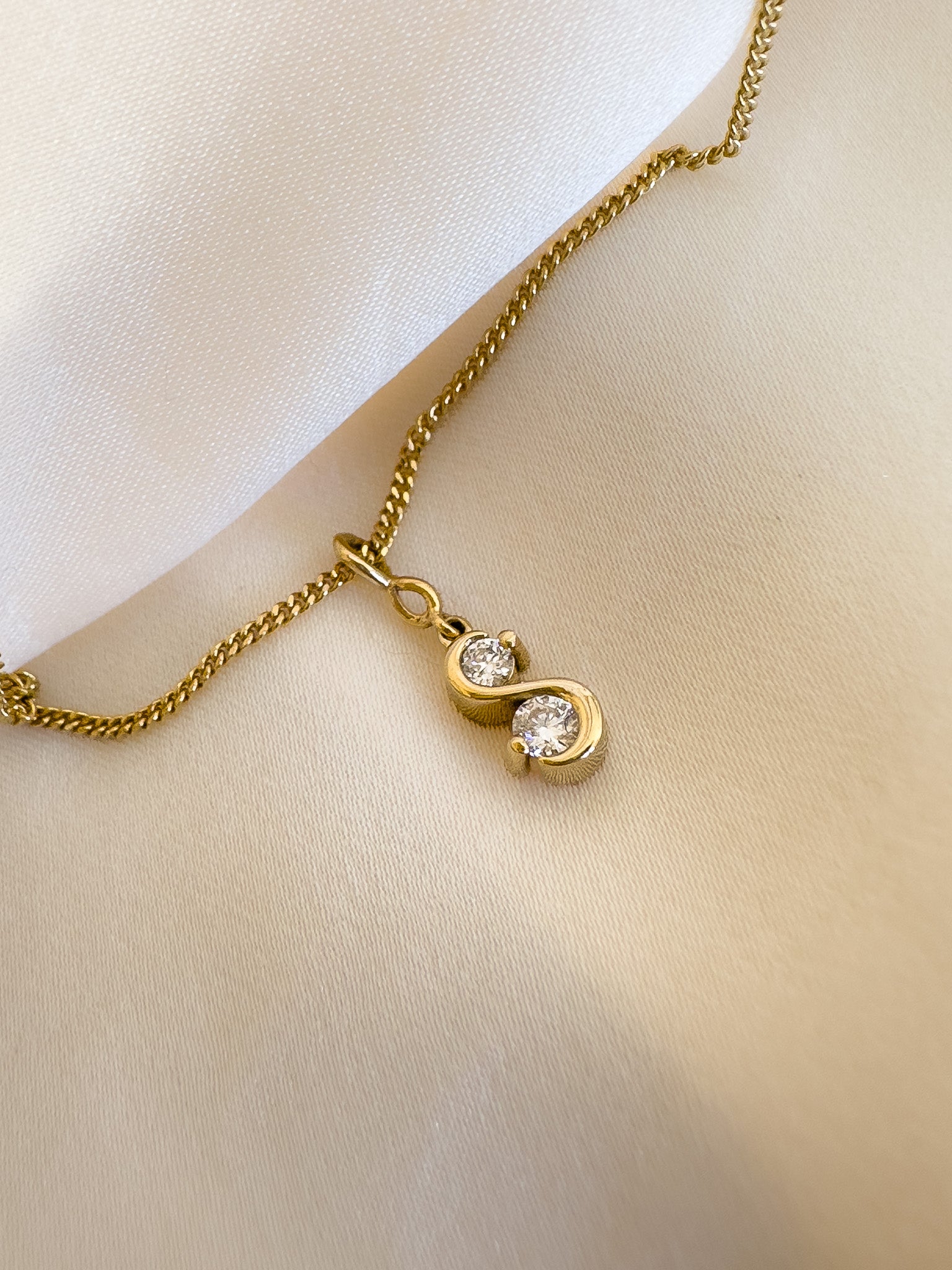 A dainty necklace featuring an infinity bail and a "Toi et Moi" or "you and me" Moissanite pendant. The pendant comes with a beautiful 9ct. gold 1mm curb chain.