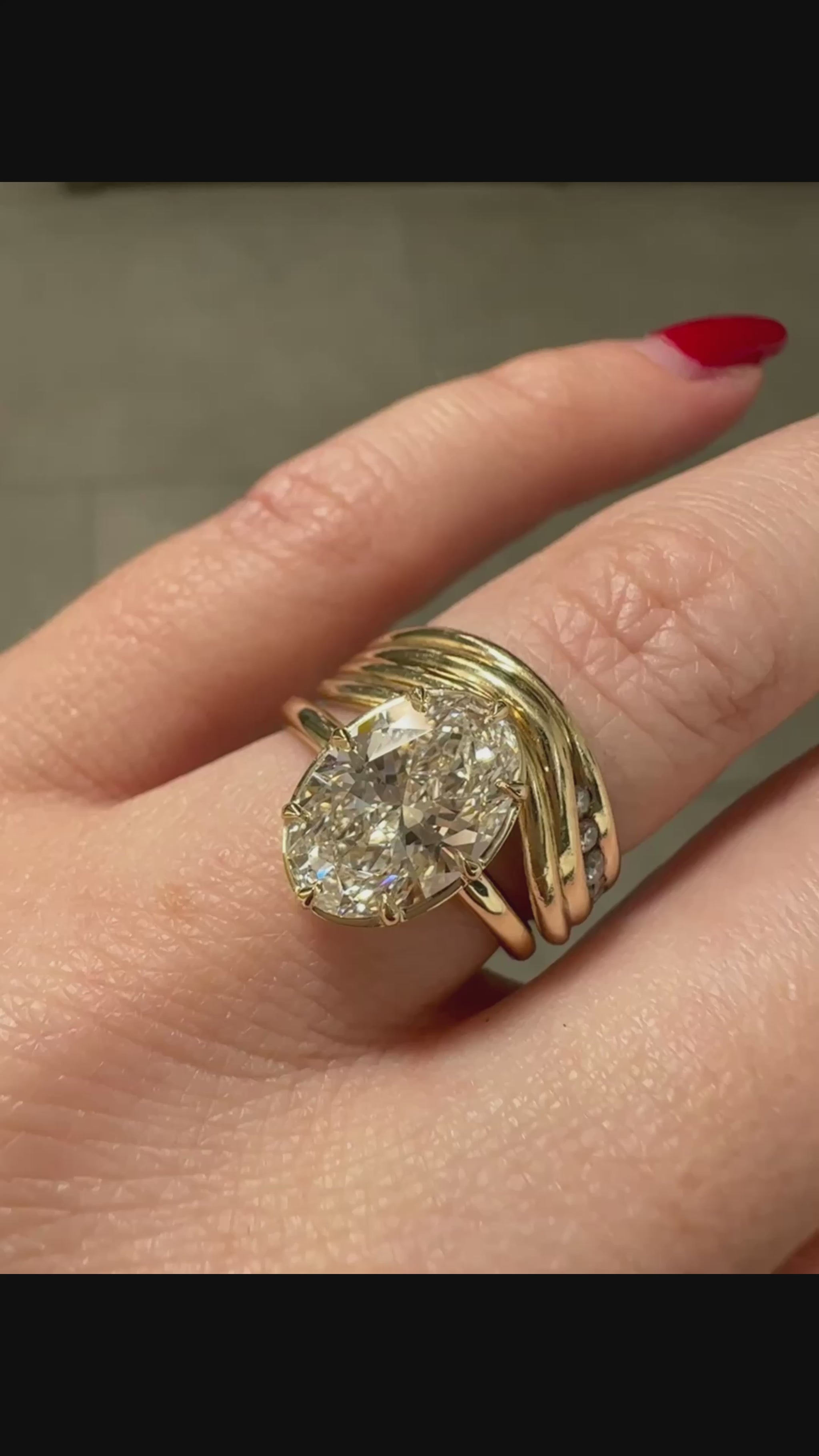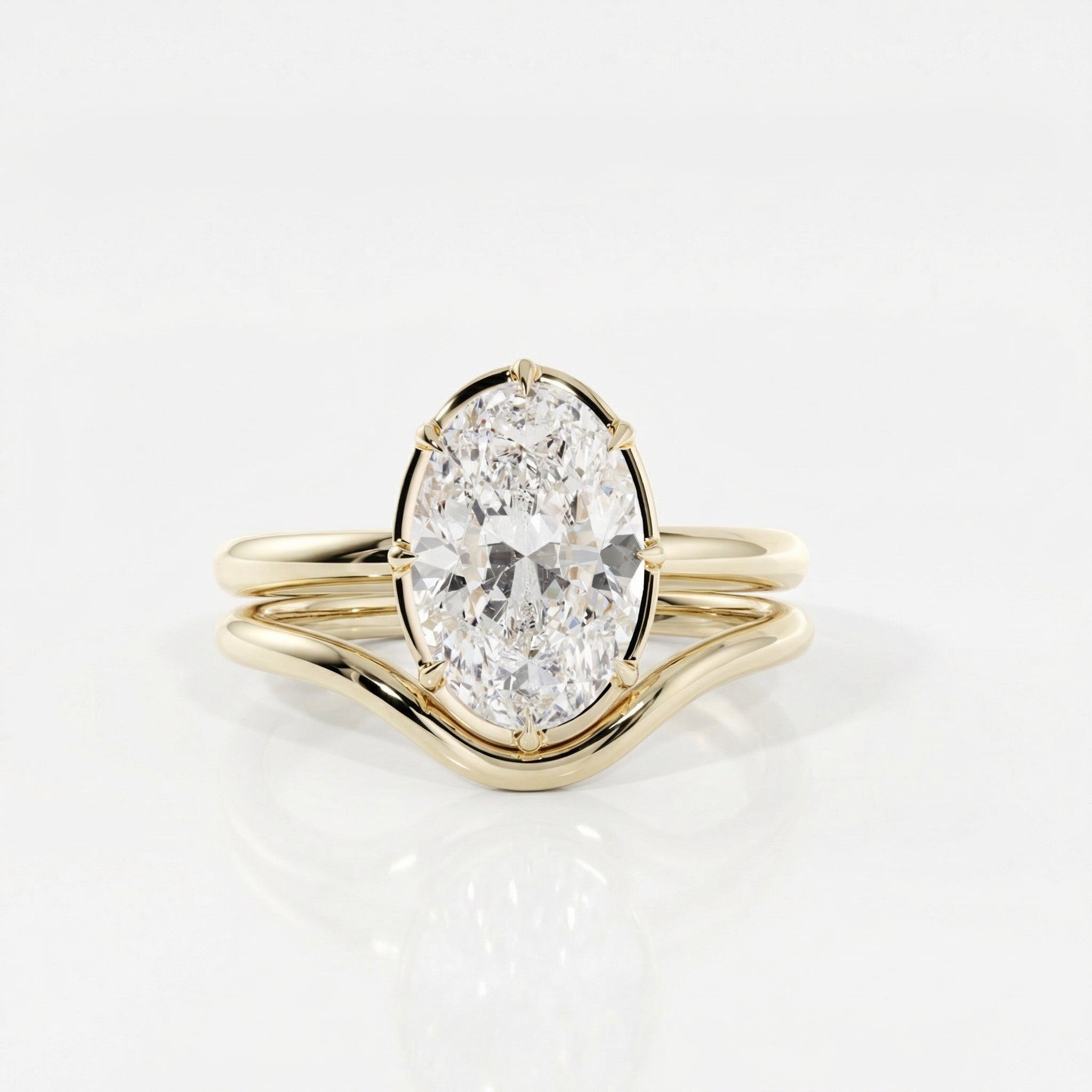 A confident solitaire centred around a striking 3ct oval diamond. The stone is set low into an open basket with eight claws, allowing light to move freely through the diamond while keeping the profile low on the hand.