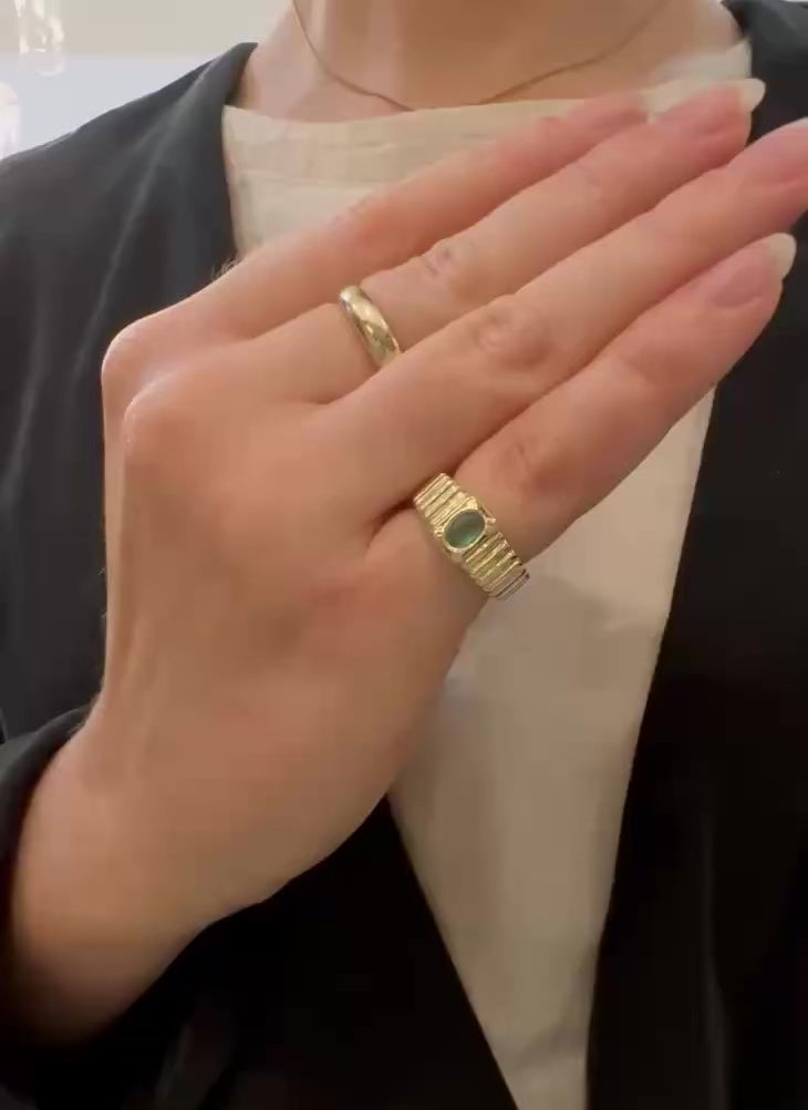 A beautiful 9ct. or 14ct. gold ring with a light bouncing, ribbed surface. Its unique surface texture is captivating and meets in the centre in a low setting housing a stunning Moissanite or emerald gemstone. Watch the videos to view it in motion.