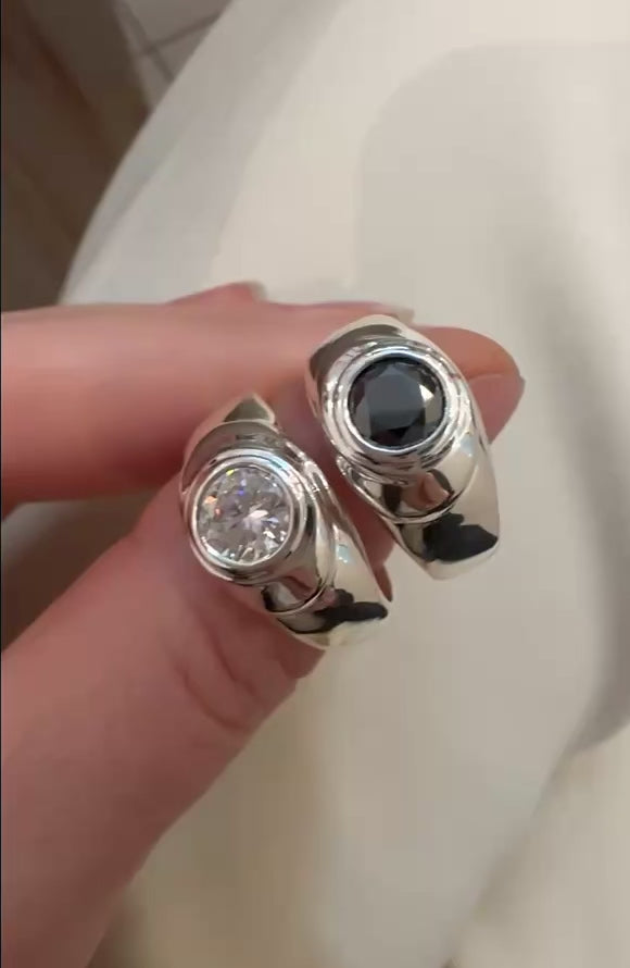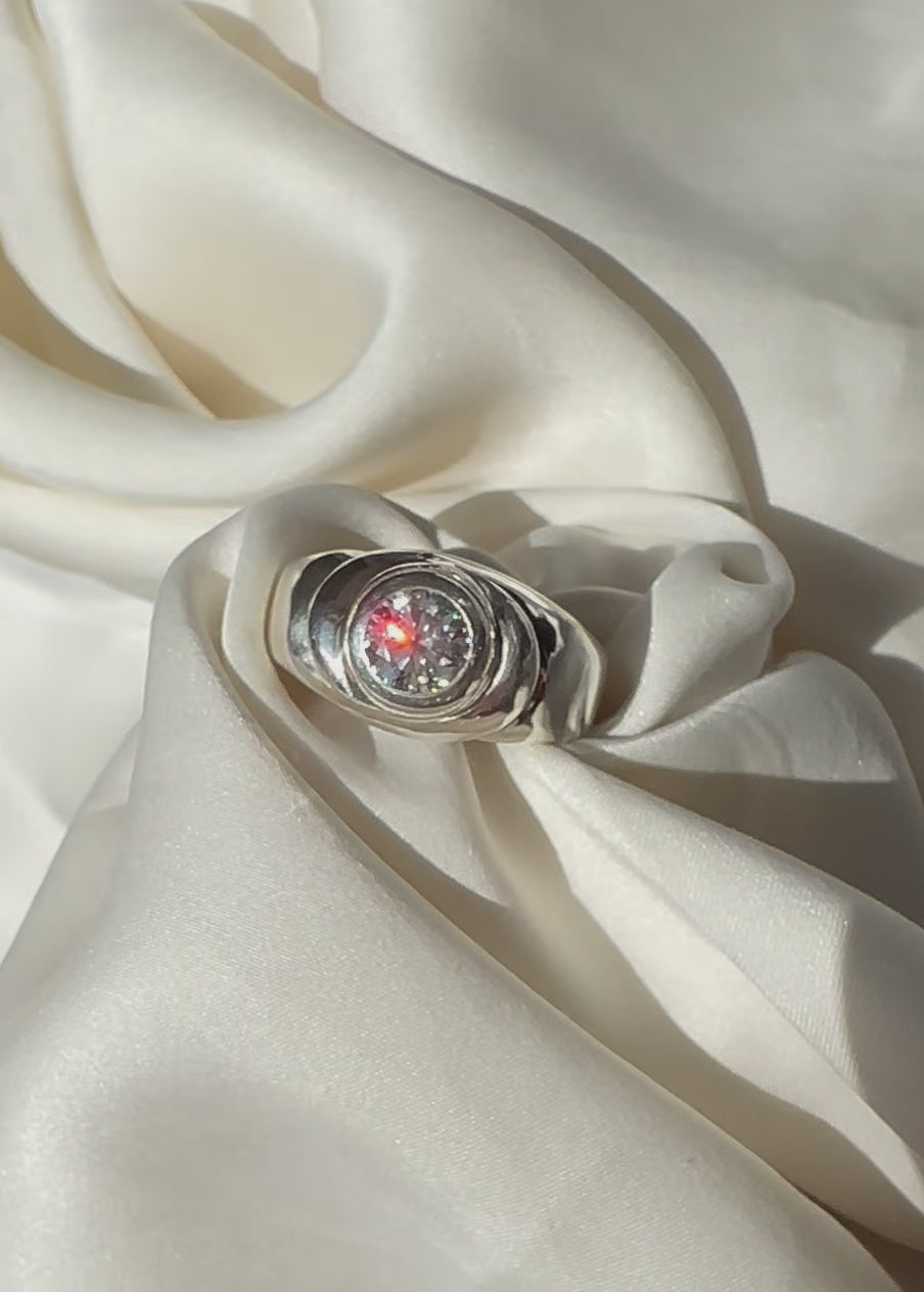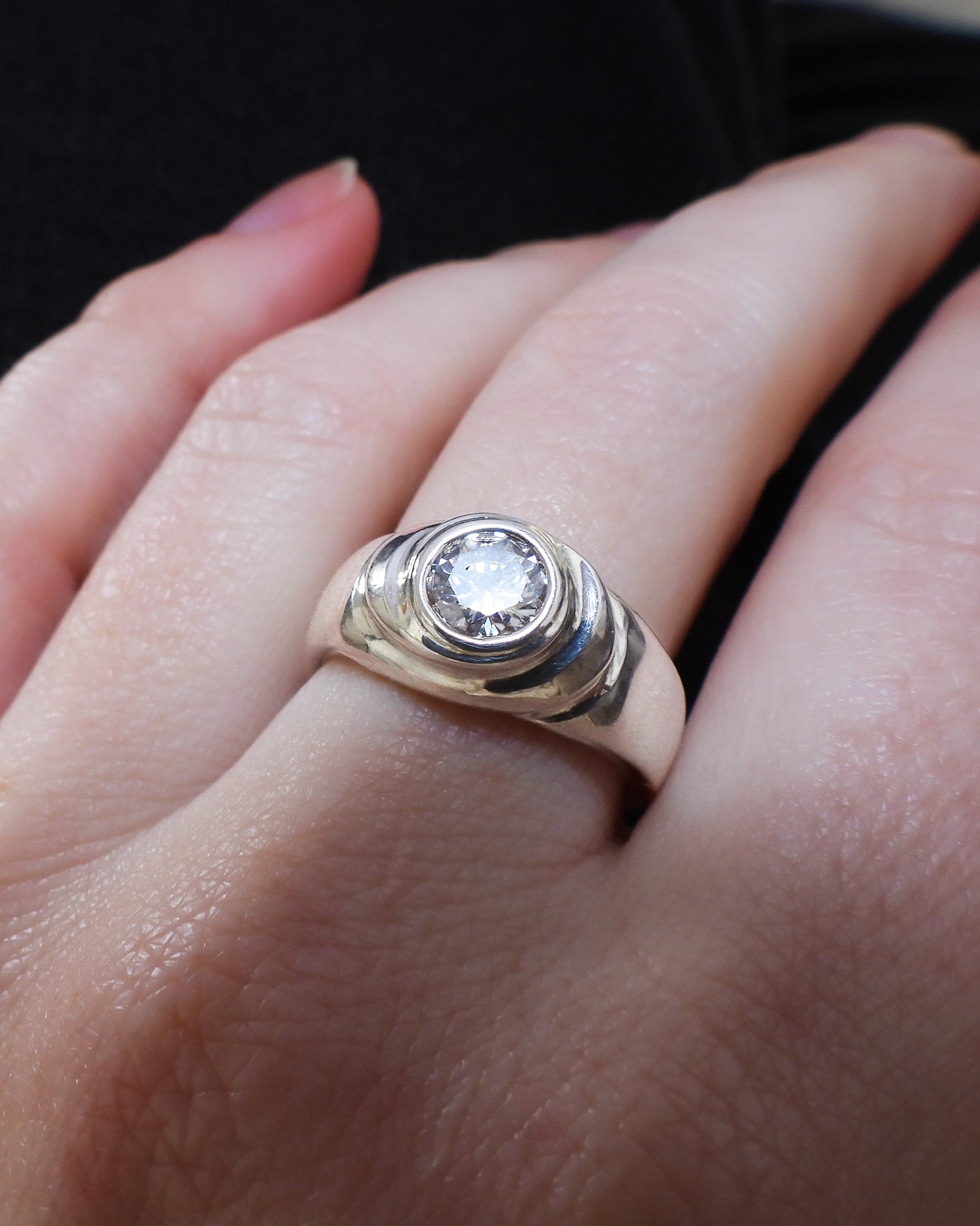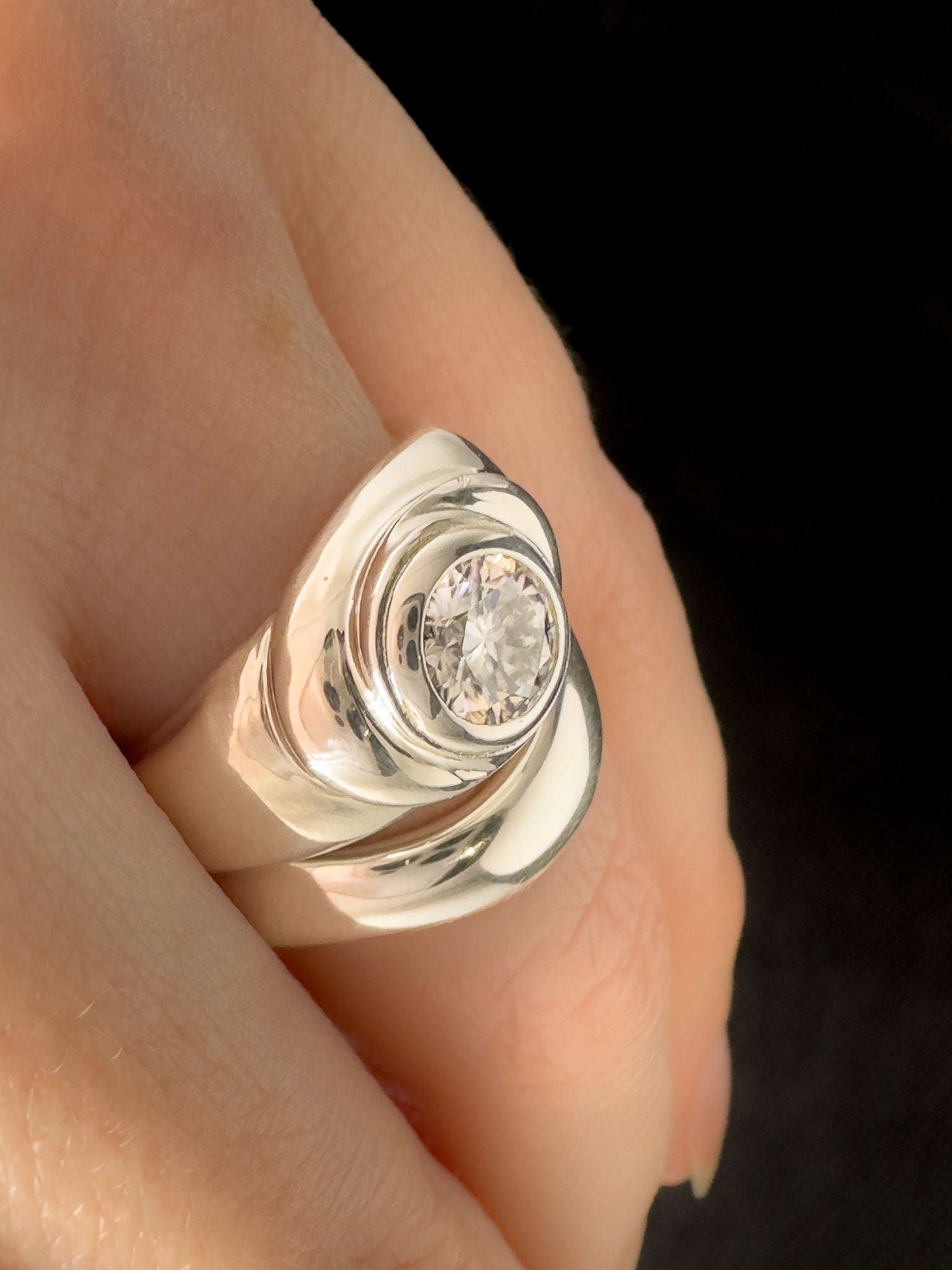 Bold, chunky, silver solitaire ring. Its completely unique twisted setting showcases a vibrant 0.8ct Moissanite gemstone.