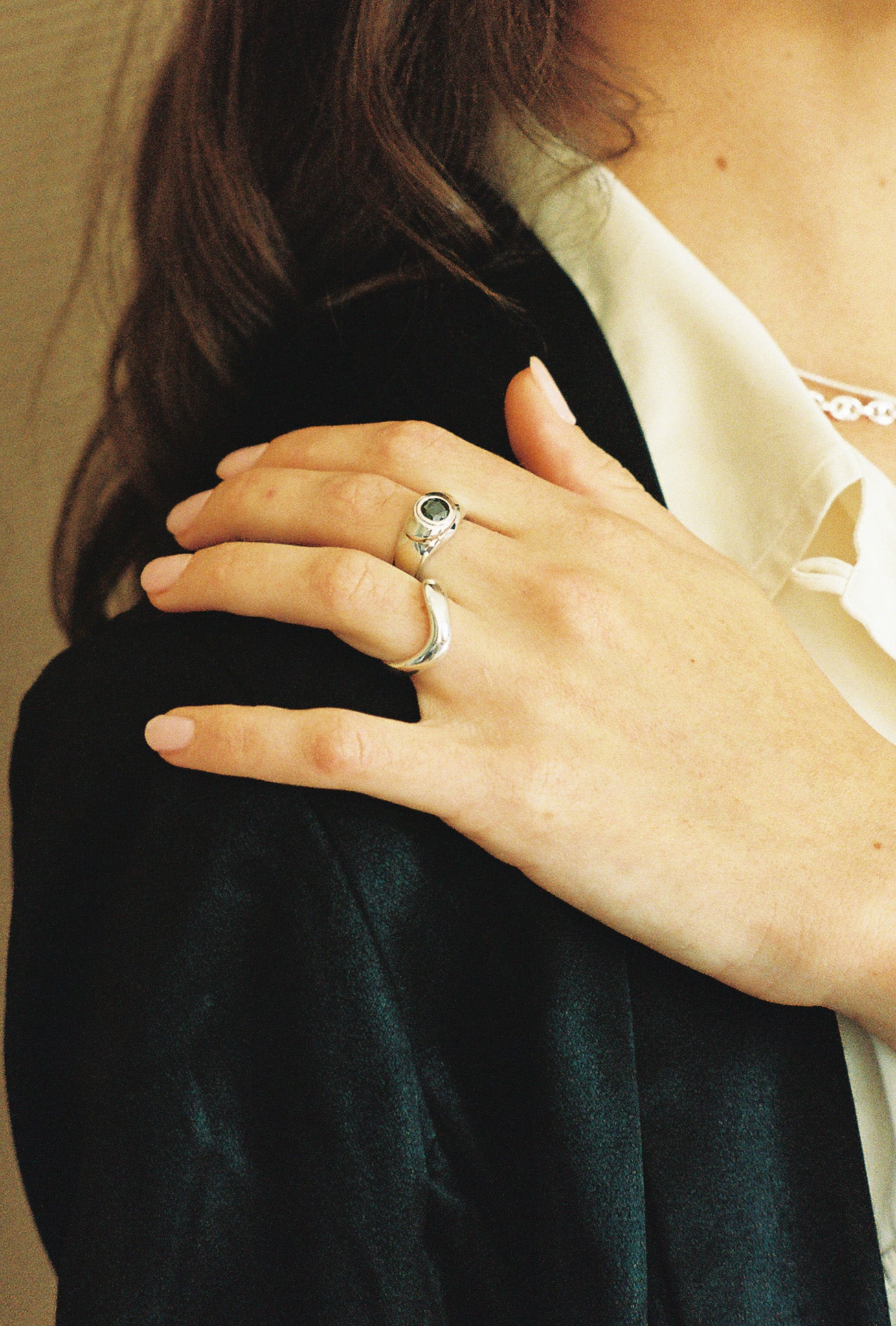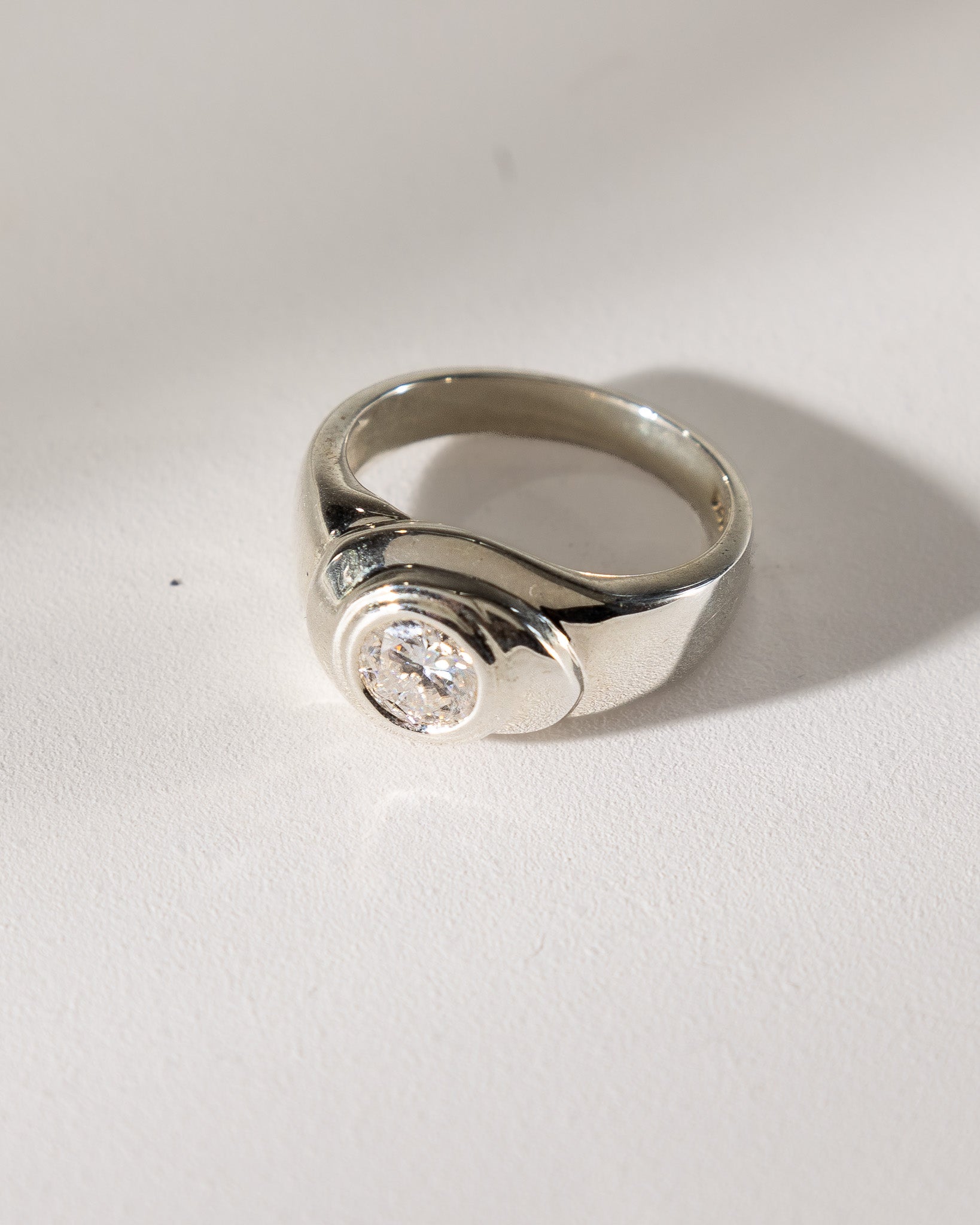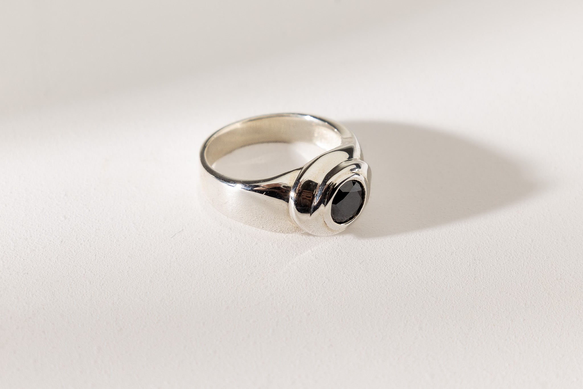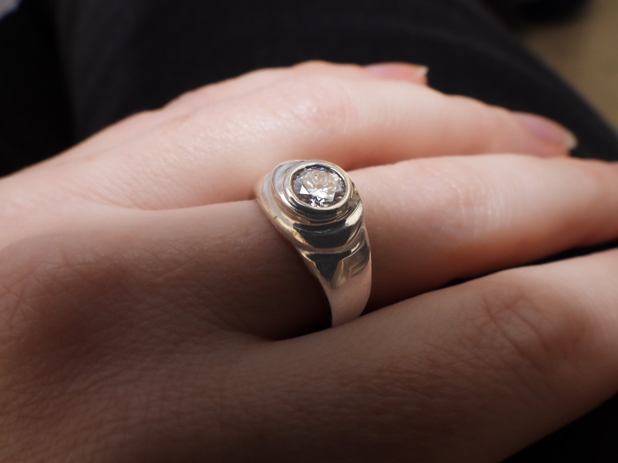 Bold, chunky, silver solitaire ring. Its completely unique twisted setting showcases a vibrant 0.8ct Moissanite gemstone.