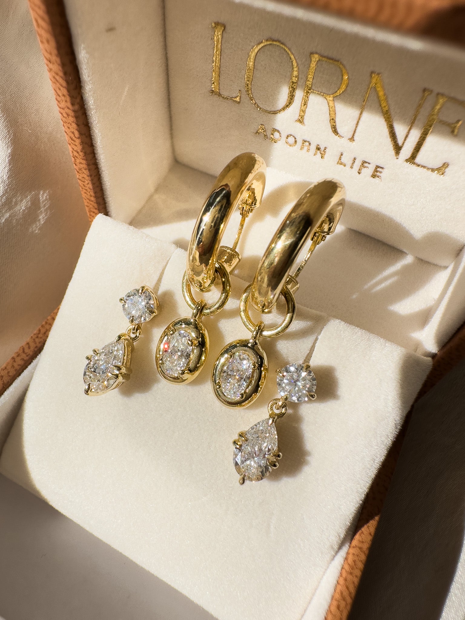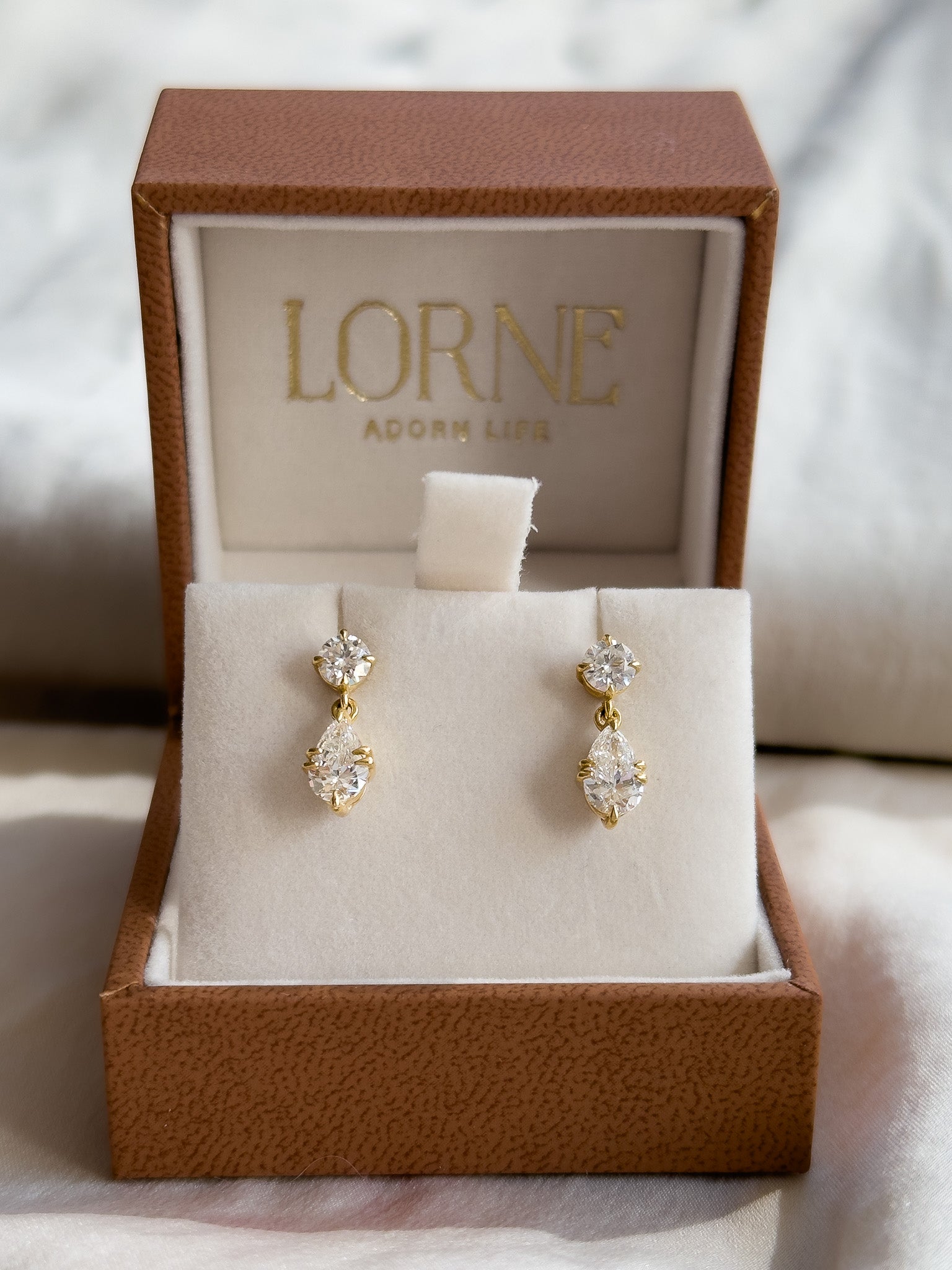 Introducing the Amara Midi Earrings. A considered take on classic drop earrings, the Amara design pairs a round stud with a suspended pear-cut stone.Nicely proportioned and designed with subtle movement, they catch the light beautifully. Ideal for bridal attire and other occasions.