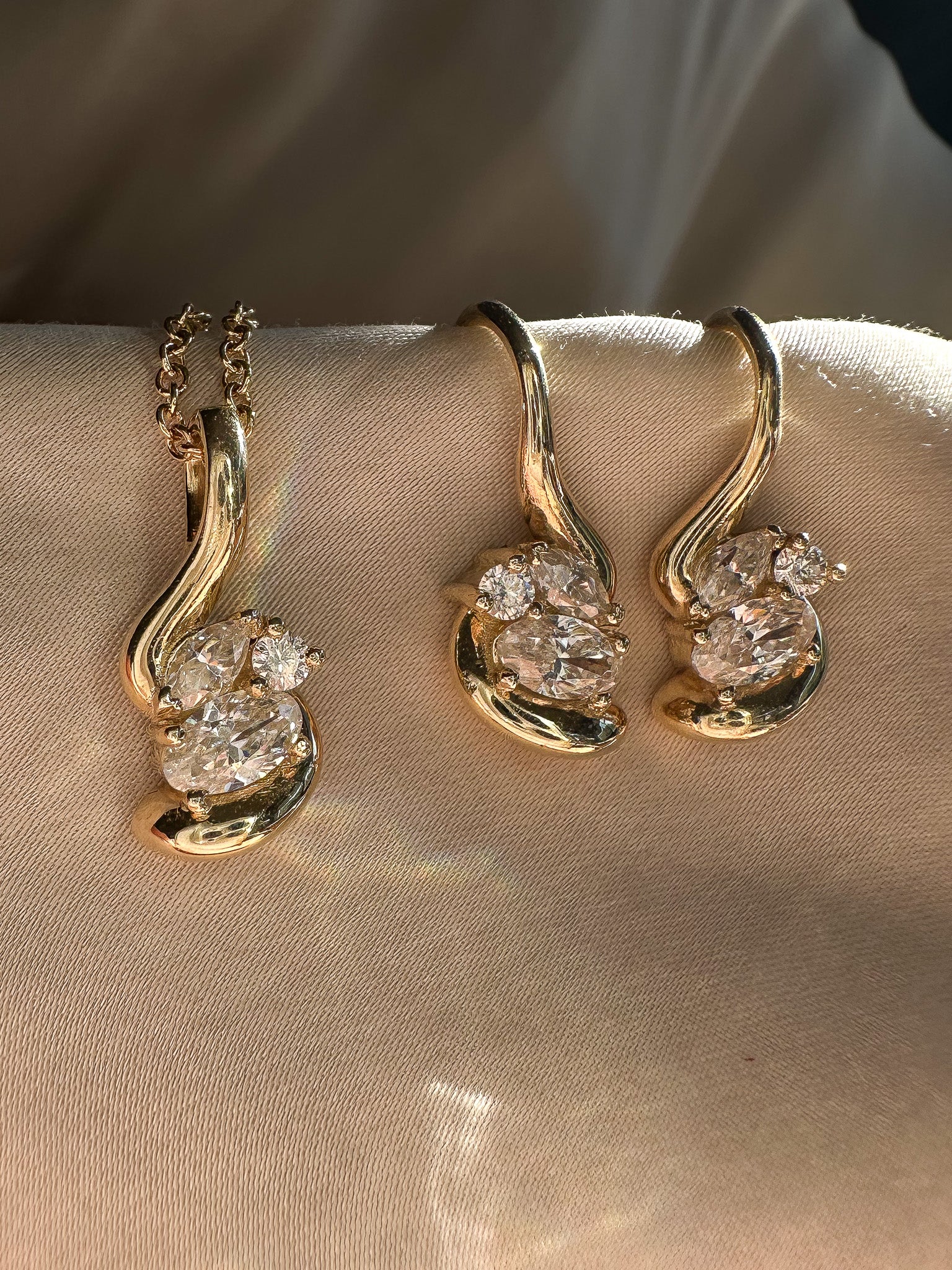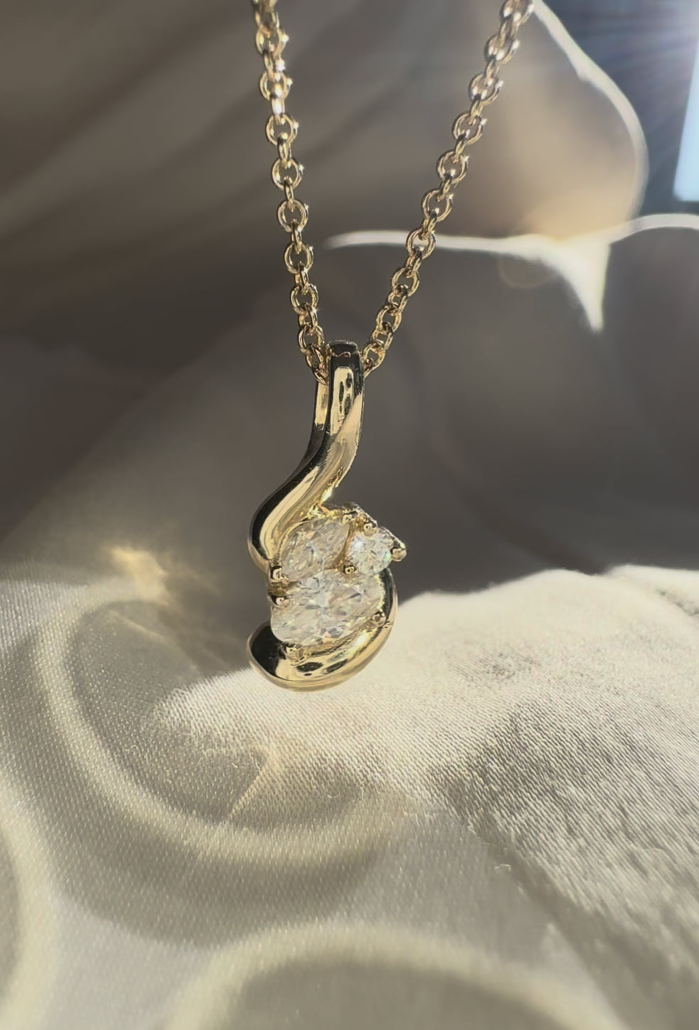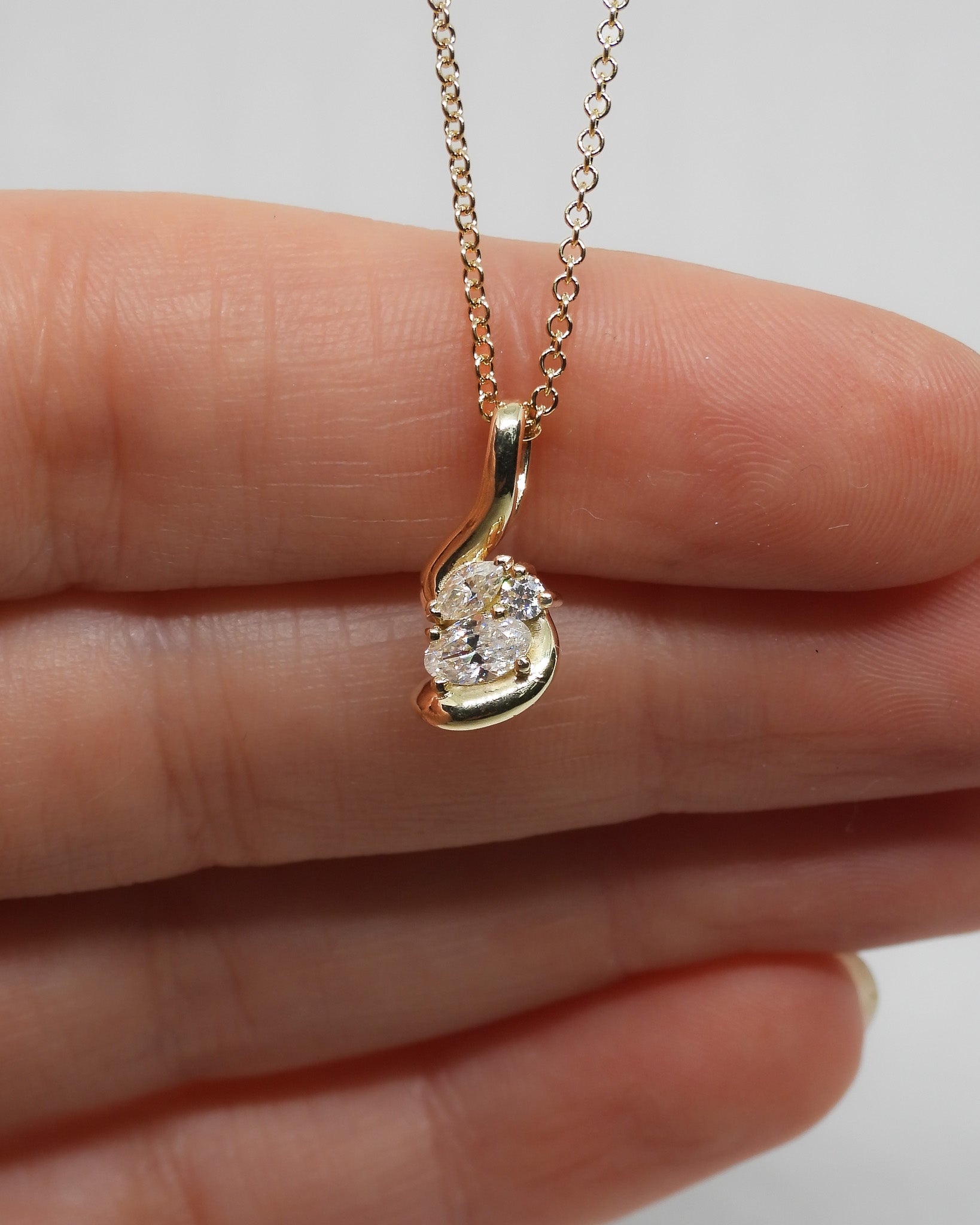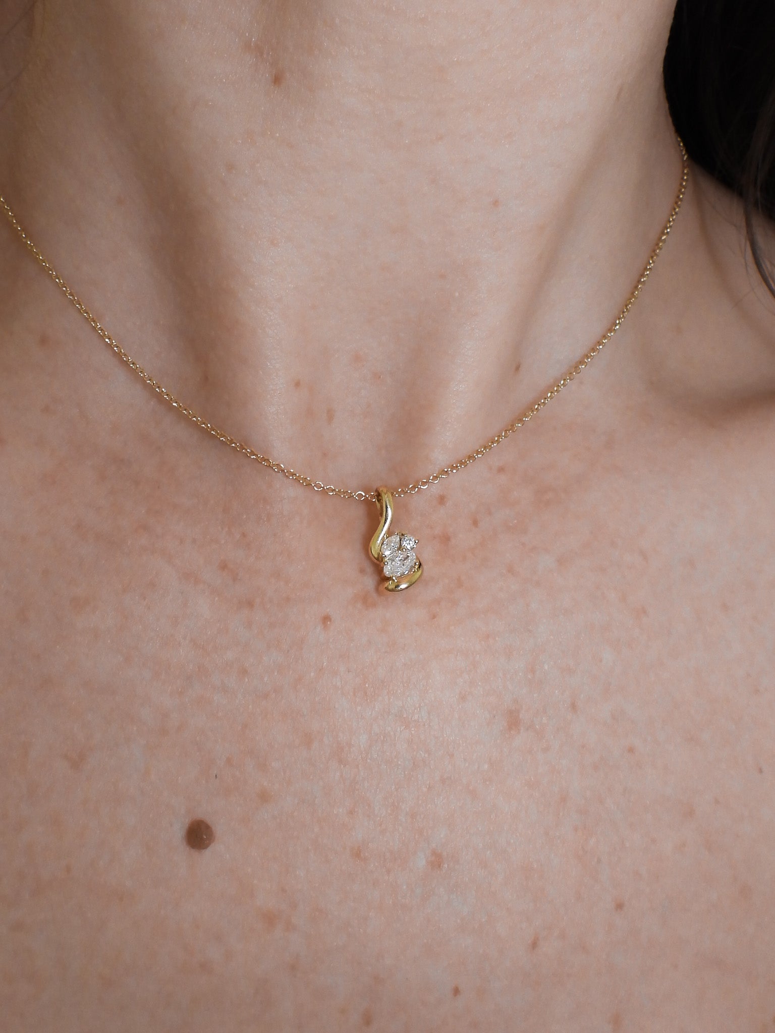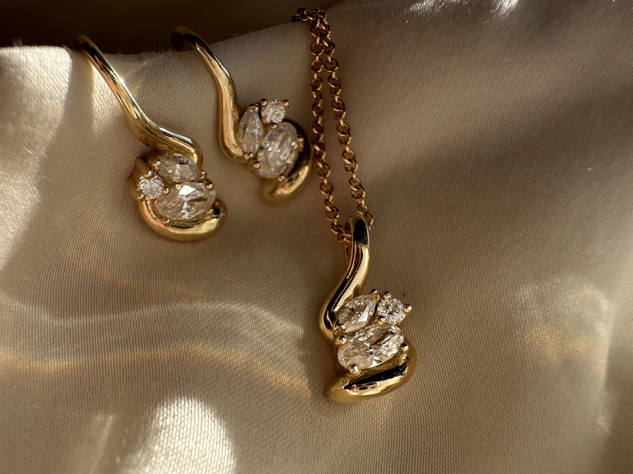 The Amelie Necklace is an elegant expression of movement and detail. Designed with soft, sculptural curves, it features a refined cluster of round, oval, and marquise-cut stones that catch the light beautifully. Whether worn alone or layered, this piece adds quiet glamour to any look.