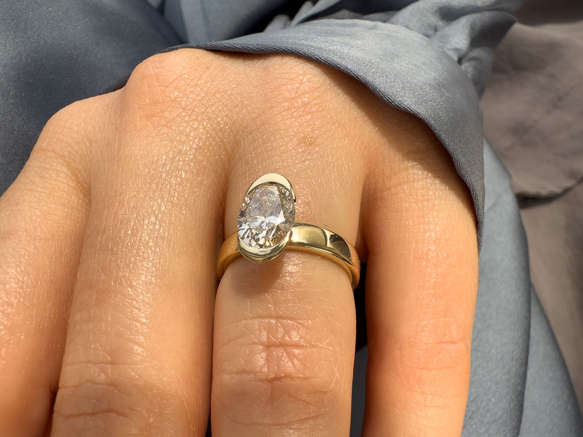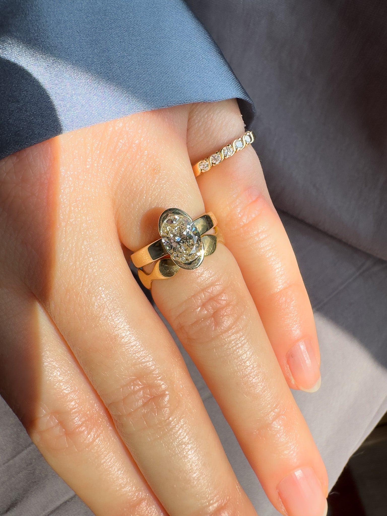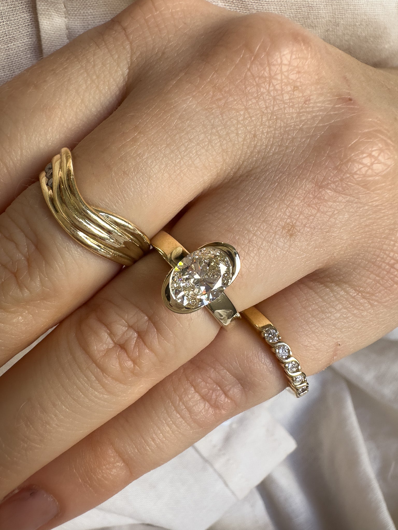 \]]Available in 1.5ct and 2ct lab-grown diamond options. A modern interpretation of the classic half bezel, the Alora Ring features an oval lab-grown diamond secured by tapering arcs of gold at the top and base of the stone. This setting leaves the sides open, allowing light to flood through and giving the diamond an almost suspended quality. Available in solid yellow or white gold, the wide band adds balance and presence, making this a ring that feels both contemporary and enduring.