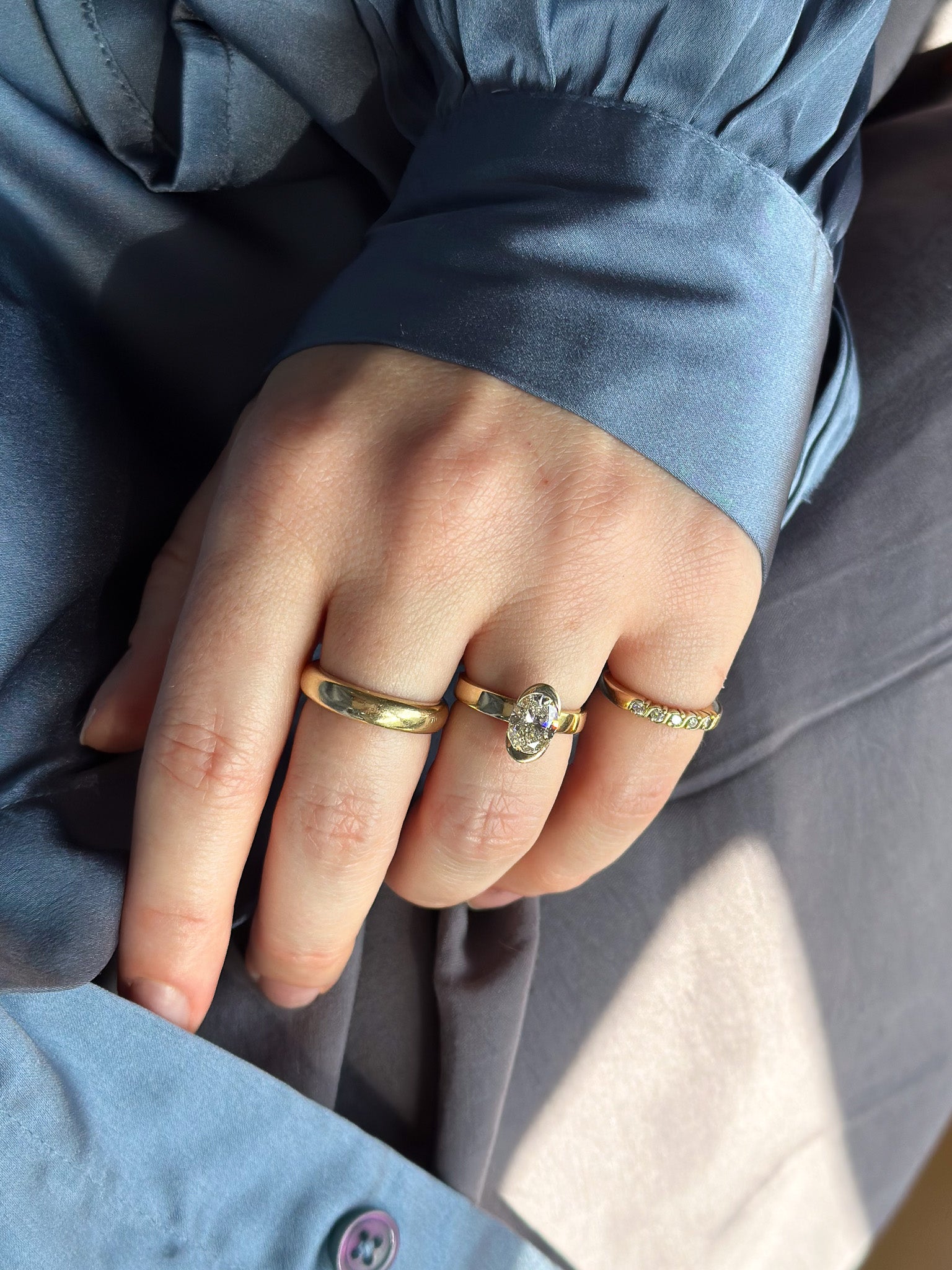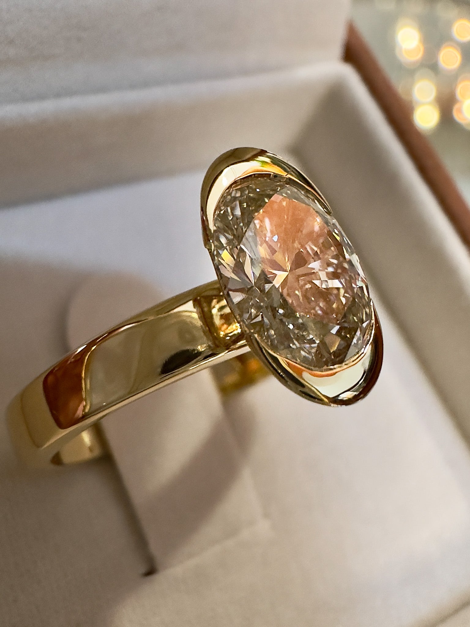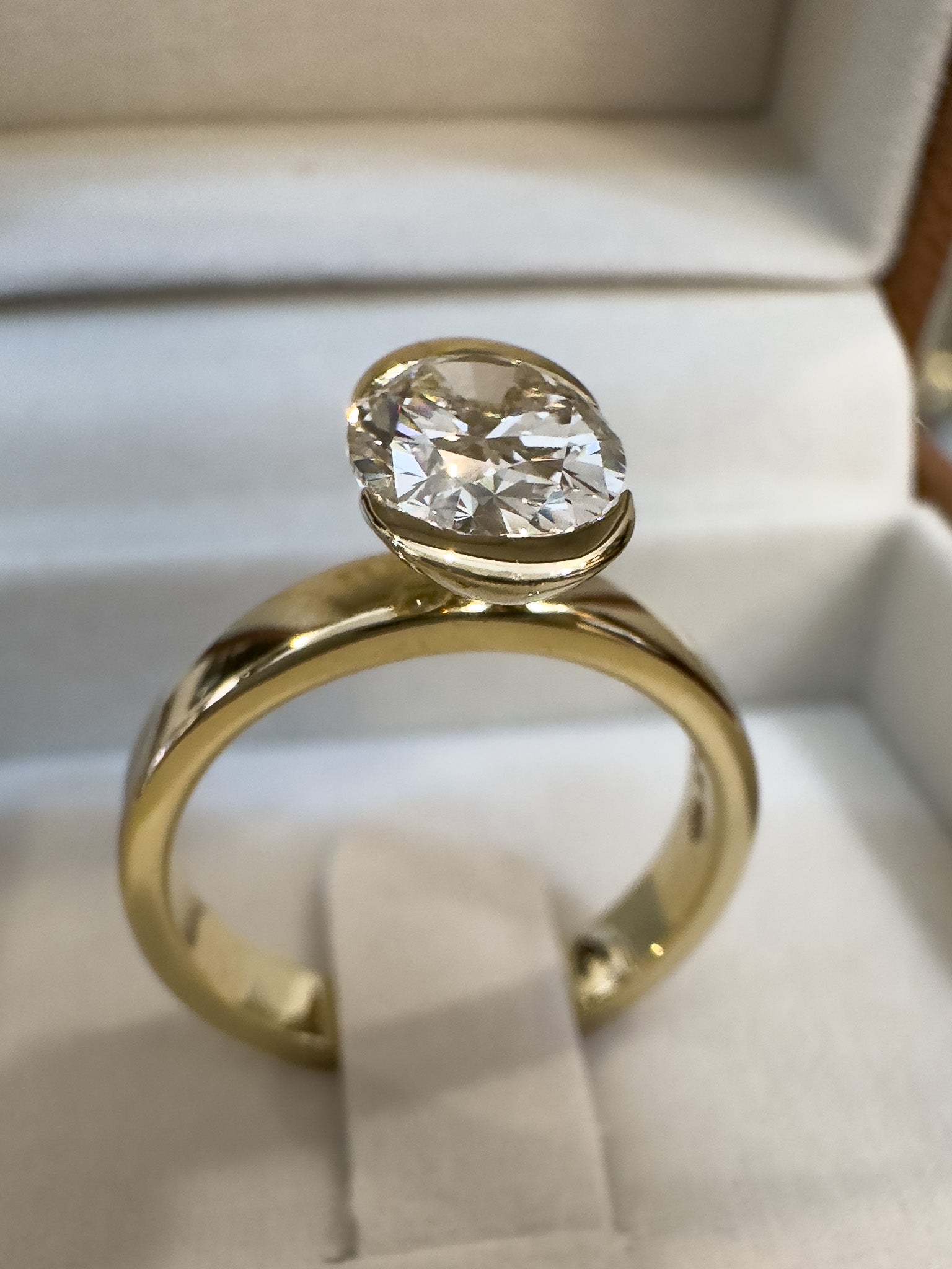 \]]Available in 1.5ct and 2ct lab-grown diamond options. A modern interpretation of the classic half bezel, the Alora Ring features an oval lab-grown diamond secured by tapering arcs of gold at the top and base of the stone. This setting leaves the sides open, allowing light to flood through and giving the diamond an almost suspended quality. Available in solid yellow or white gold, the wide band adds balance and presence, making this a ring that feels both contemporary and enduring.