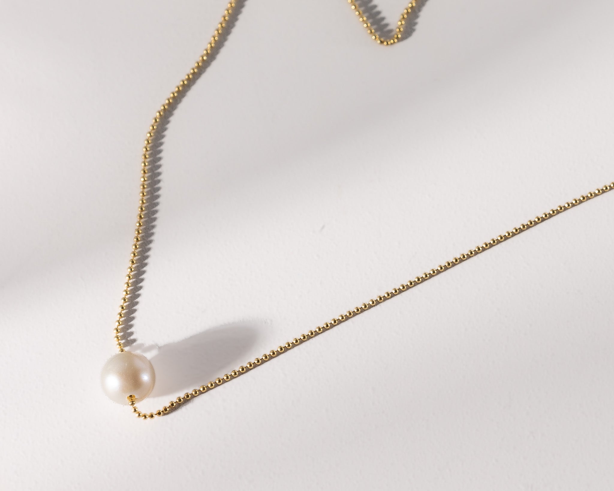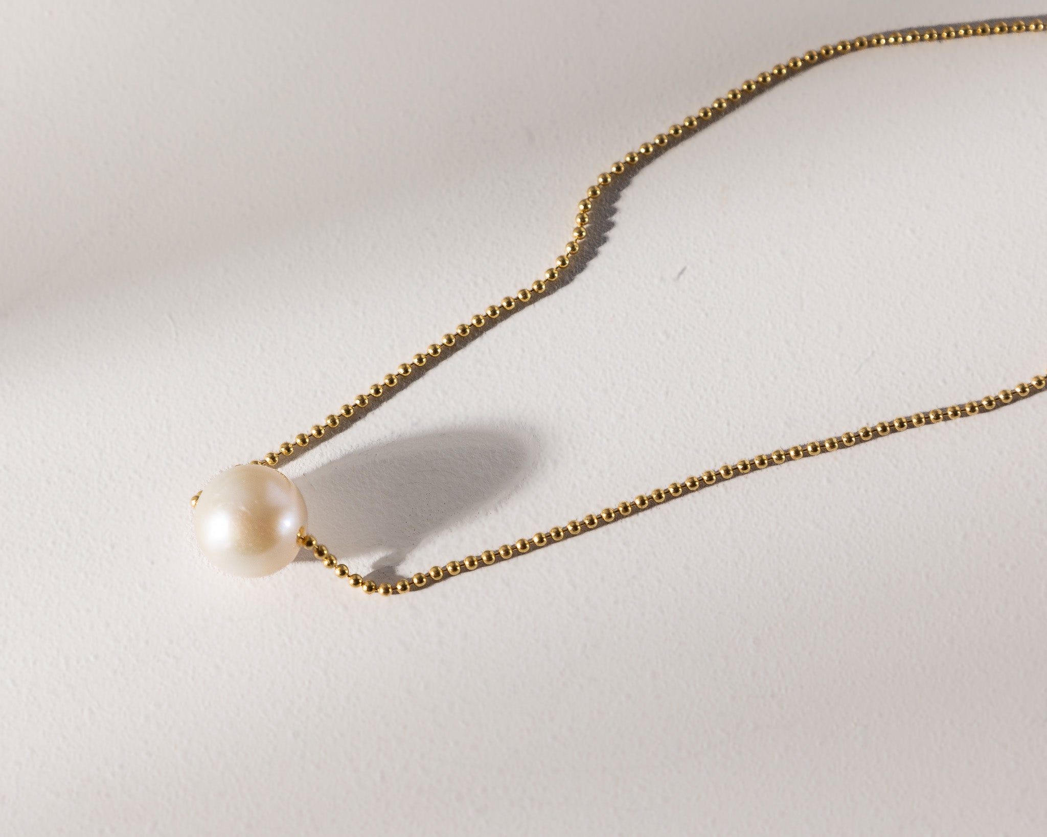 This ball chain necklace features an AAA-grade freshwater pearl strung on a unique sterling silver ball chain, creating a classic yet playful look.