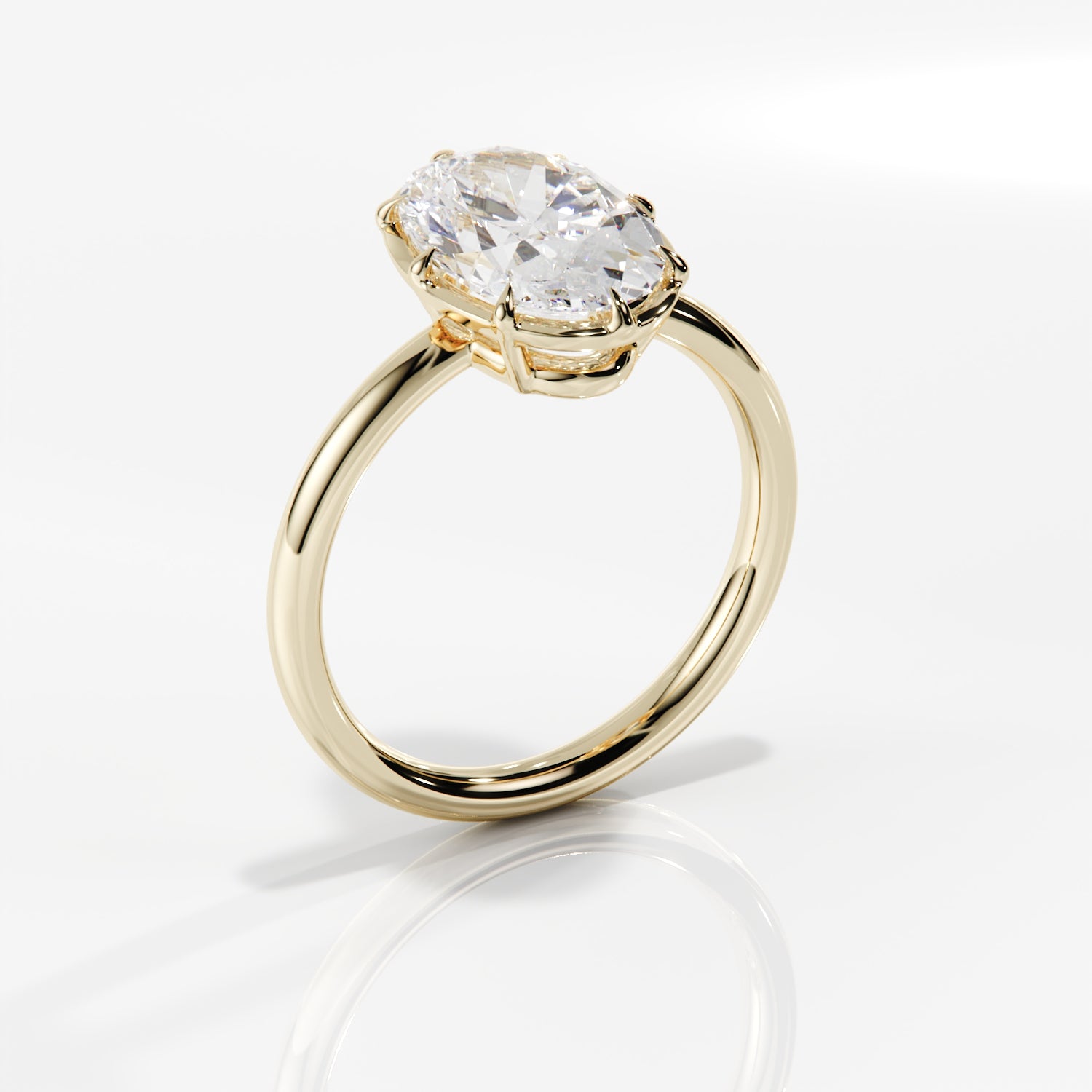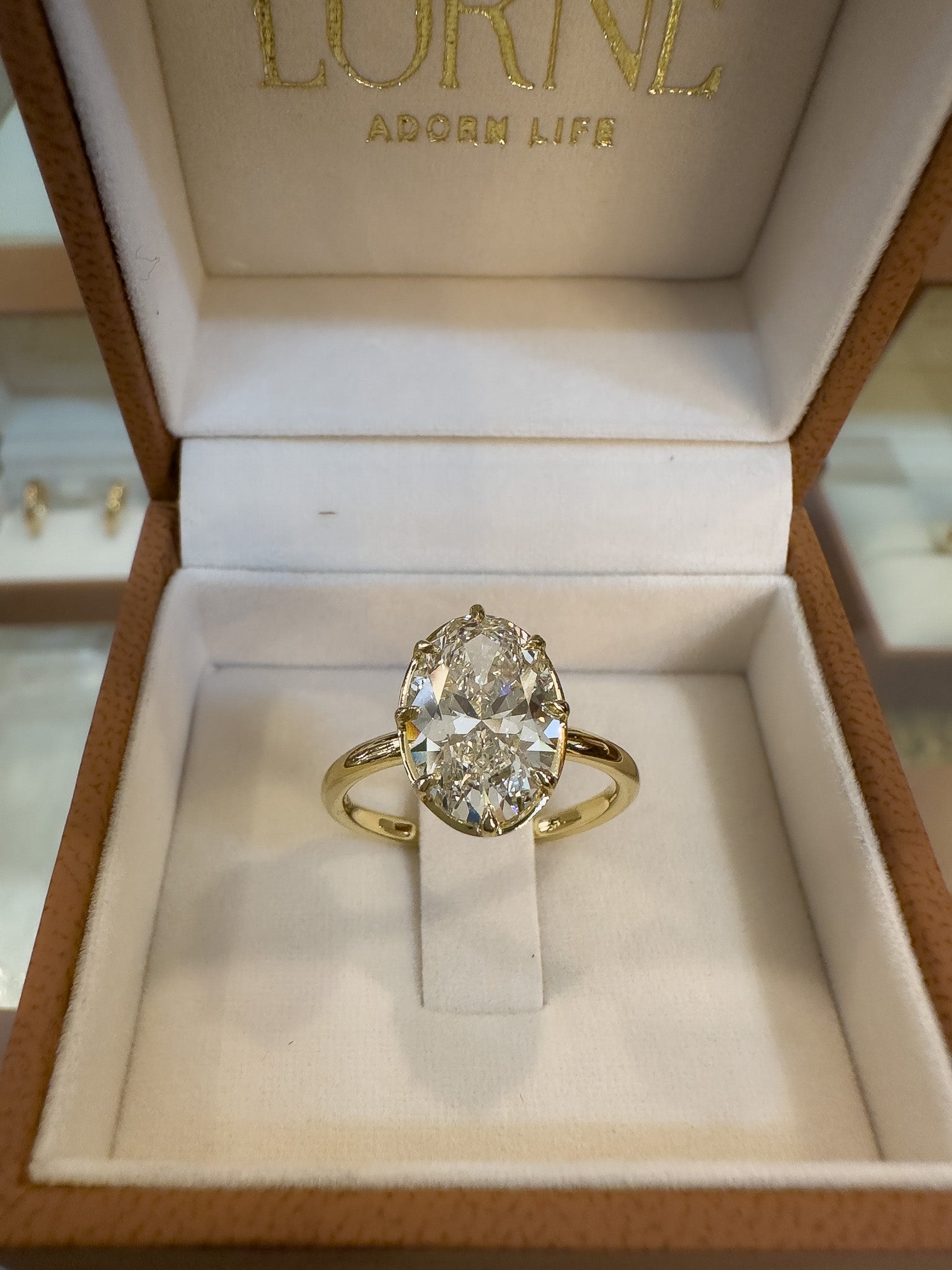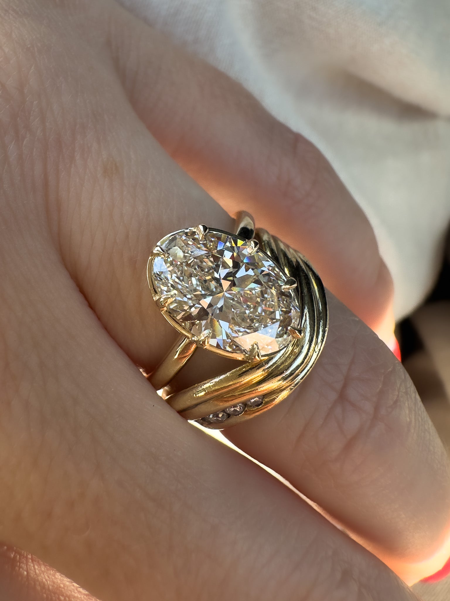 A confident solitaire centred around a striking 3ct oval diamond. The stone is set low into an open basket with eight claws, allowing light to move freely through the diamond while keeping the profile low on the hand.