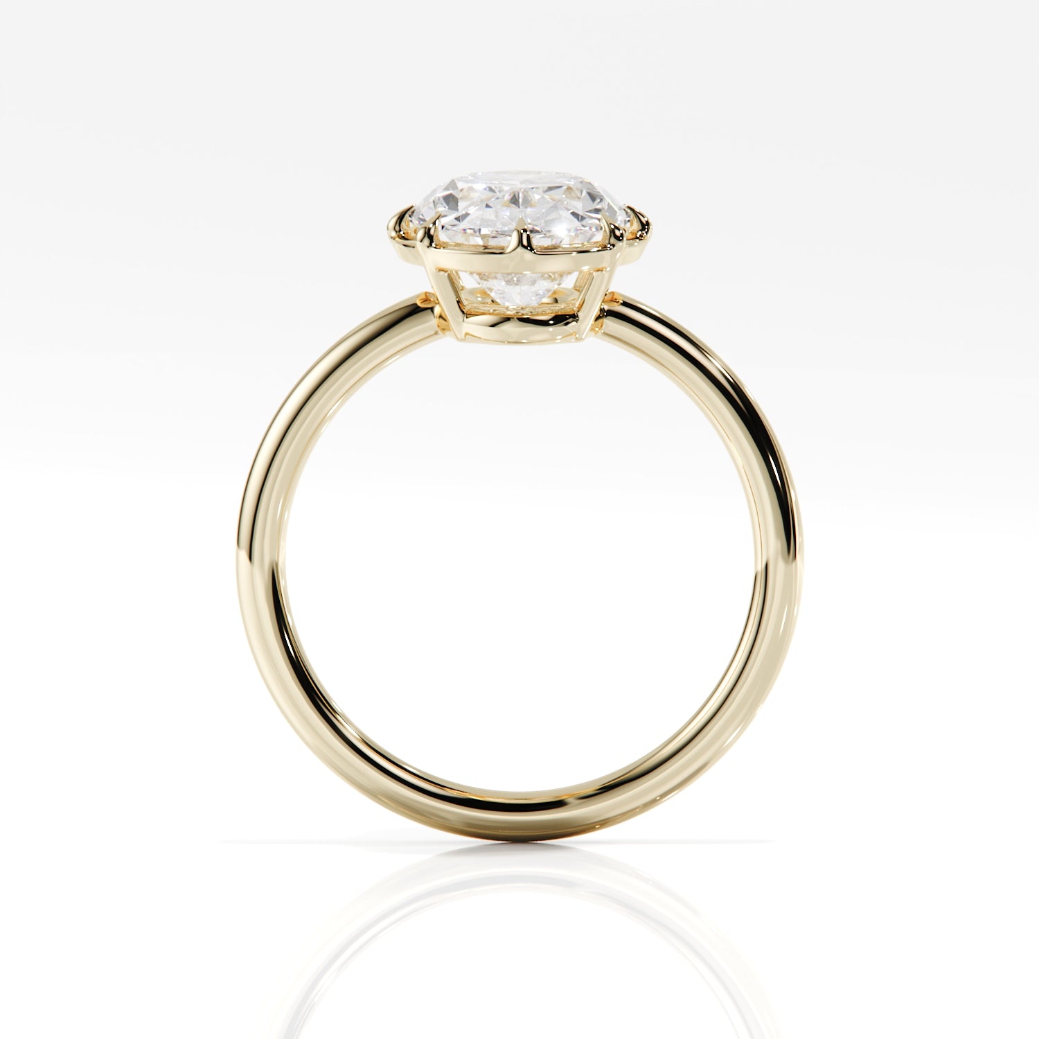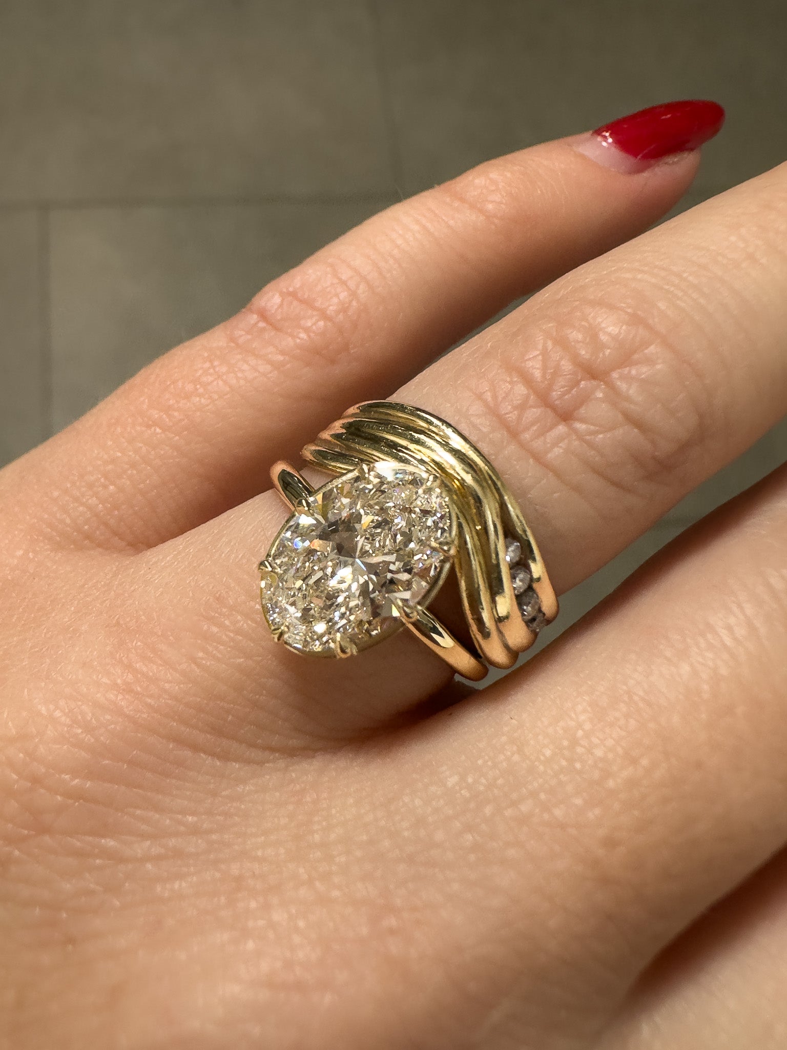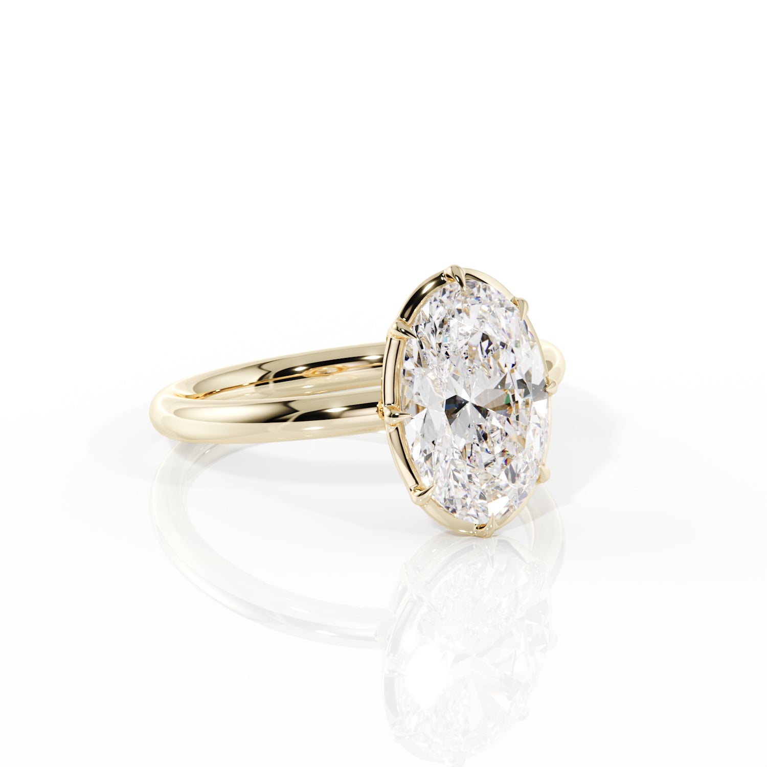 A confident solitaire centred around a striking 3ct oval diamond. The stone is set low into an open basket with eight claws, allowing light to move freely through the diamond while keeping the profile low on the hand.