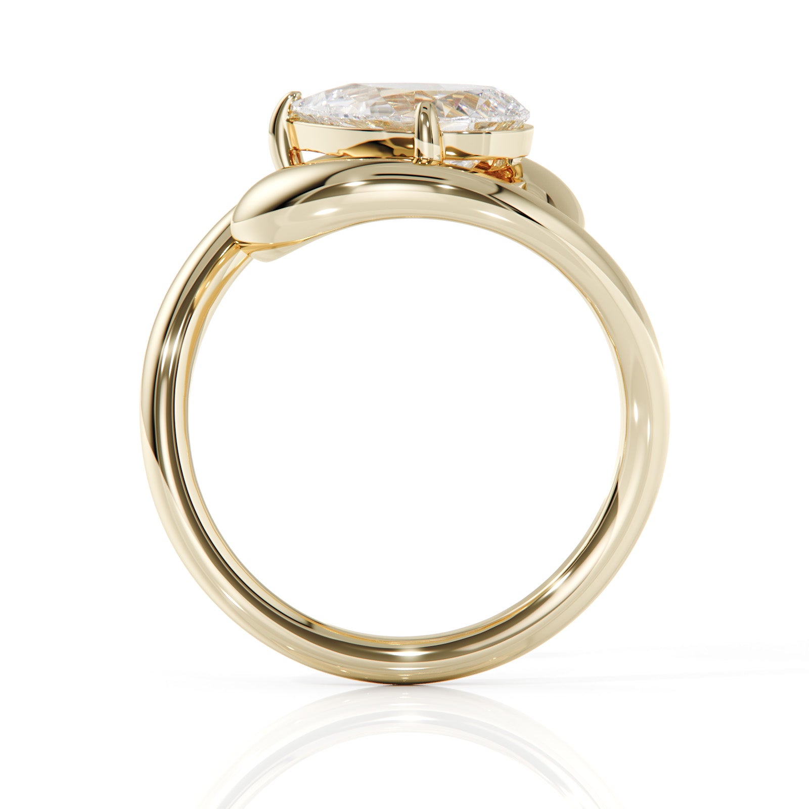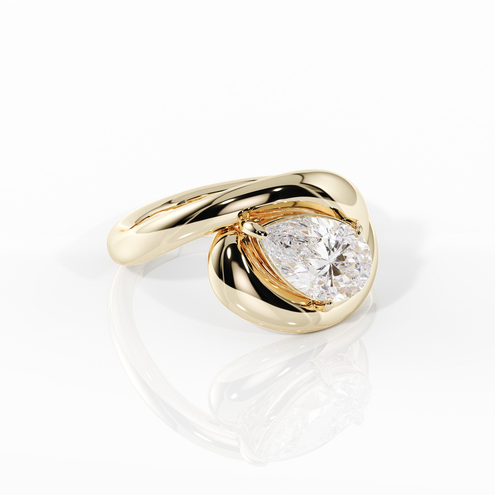 The Rosa Ring is a sculptural crossover ring that wraps gently around the finger with soft, fluid motion. Its rounded, bulbous form gives it a distinctive presence, balanced by the elegance of a 1.5ct pear cut lab-grown diamond. The open crossover design allows light to move freely through the stone, highlighting its brilliance from every angle.