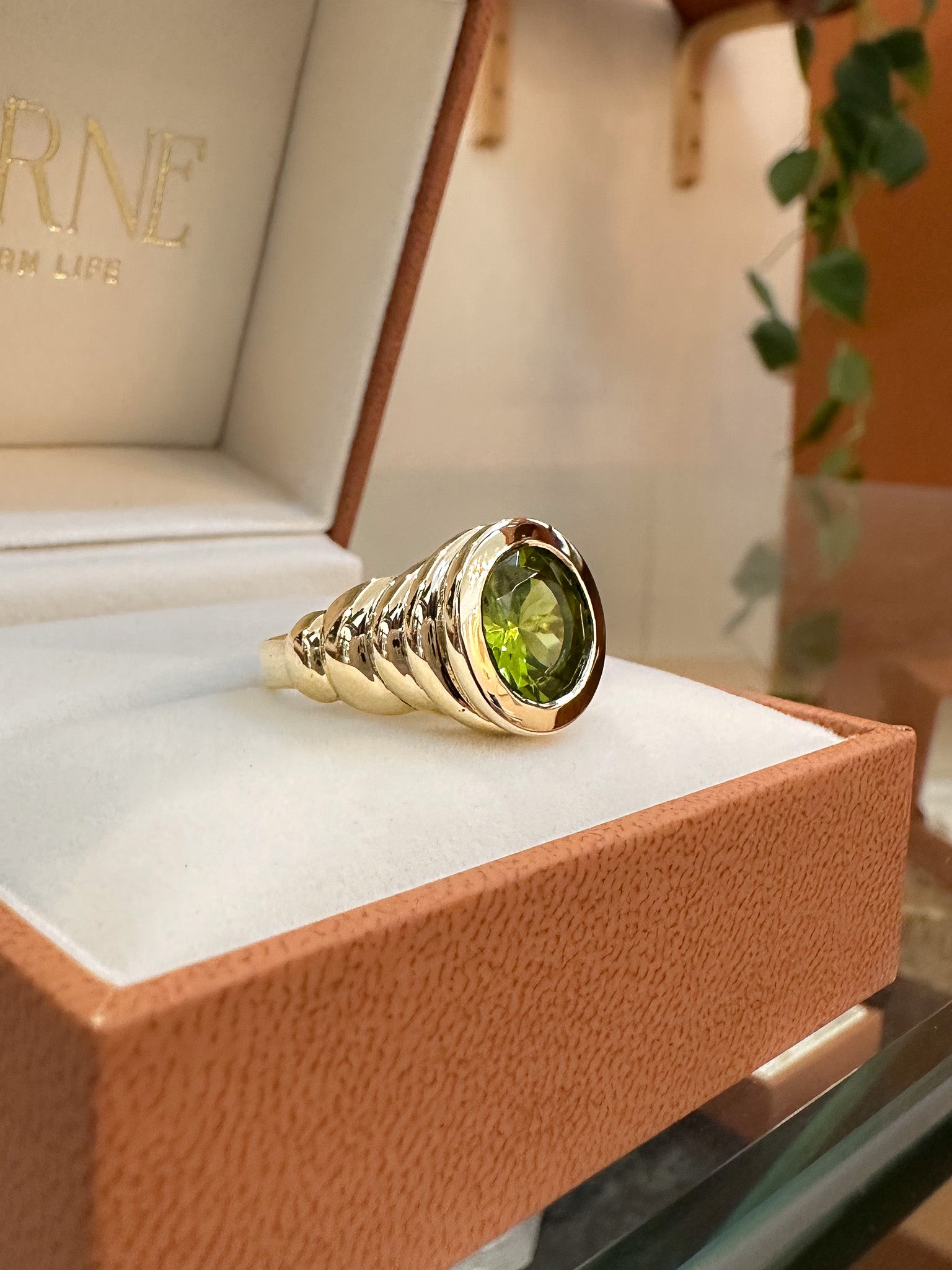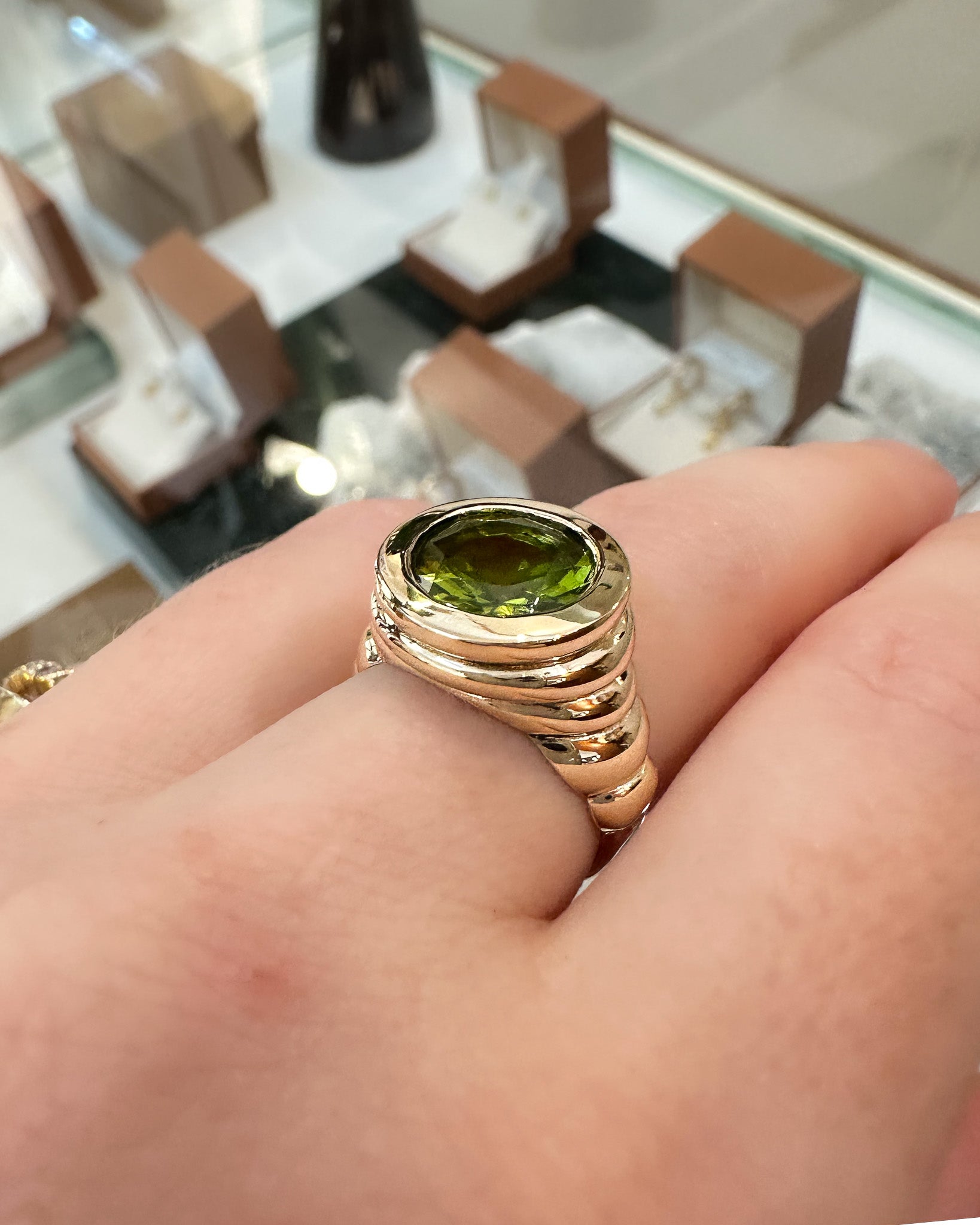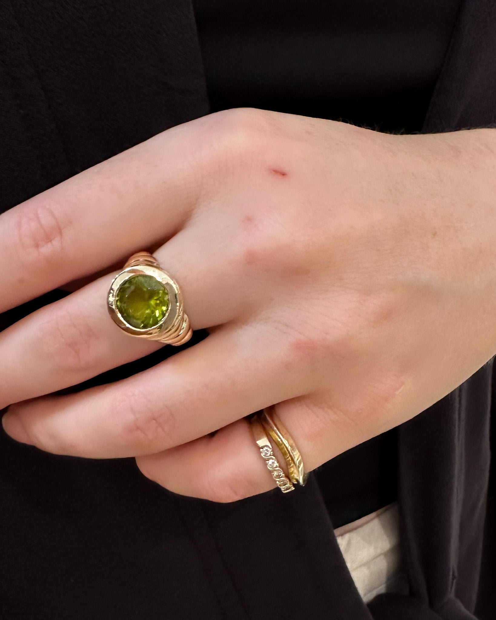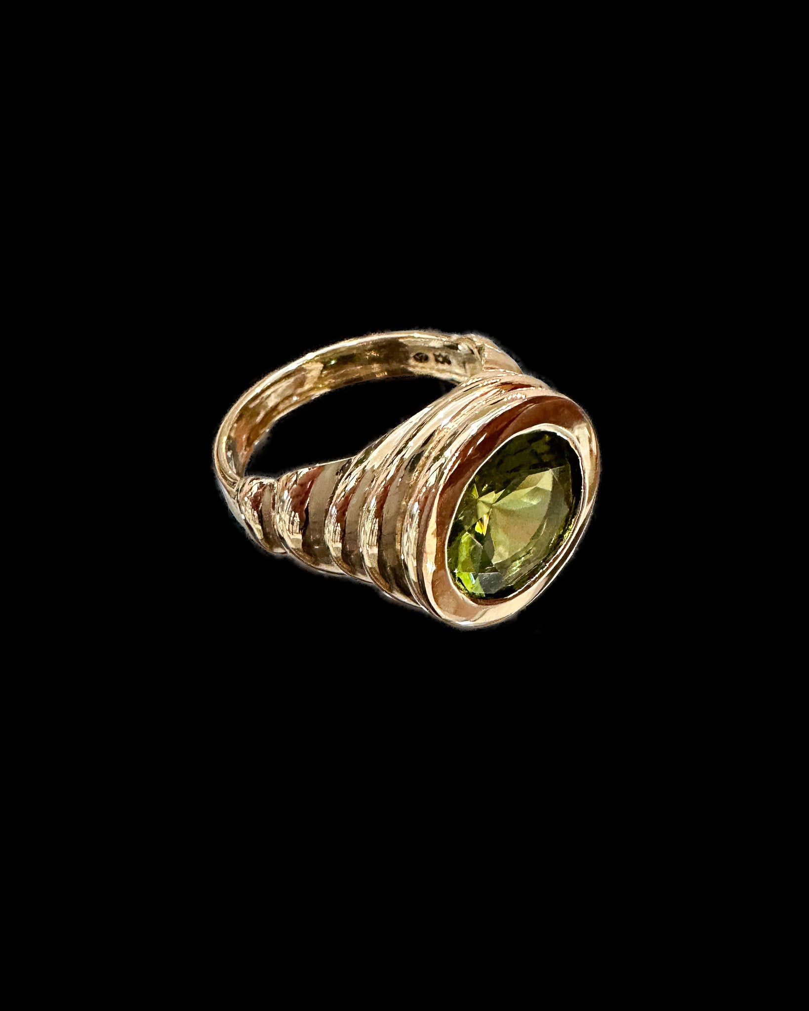 Bold, gold, and impossible to ignore. This sculptural ring features a striking 4ct diamond set in a smooth bezel, framed by a wide, ribbed gold band that plays with light and form. The bold contours and reflective surfaces make this piece as eye-catching as it is unique.